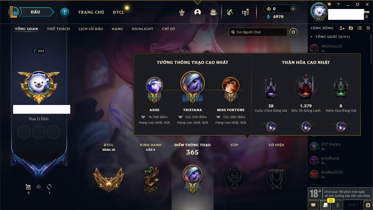 Rank Đơn: Chưa rank mùa nào Khung: Chưa có khung Tướng: 0 - Còn 2000 THX Trang Phục: 0 Rank ĐTCL: Chưa Rank Linh Thú: 14