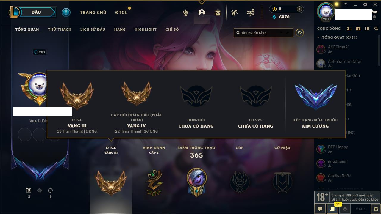 Rank Đơn: Chưa Rank Khung: Chưa có khung Tướng: 161 - Còn 16793 THX Trang Phục: 108 Rank ĐTCL: Chưa Rank Linh Thú: 93