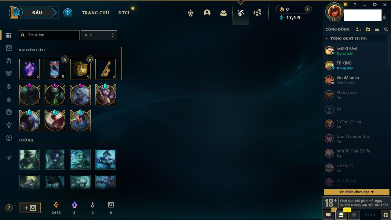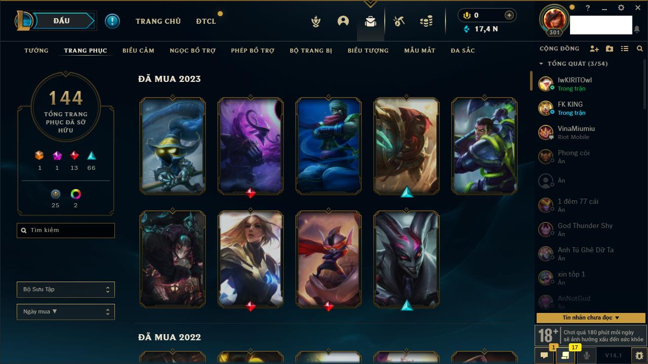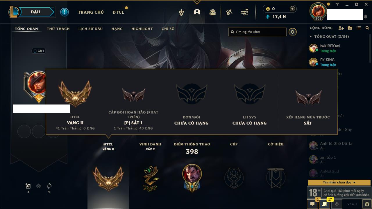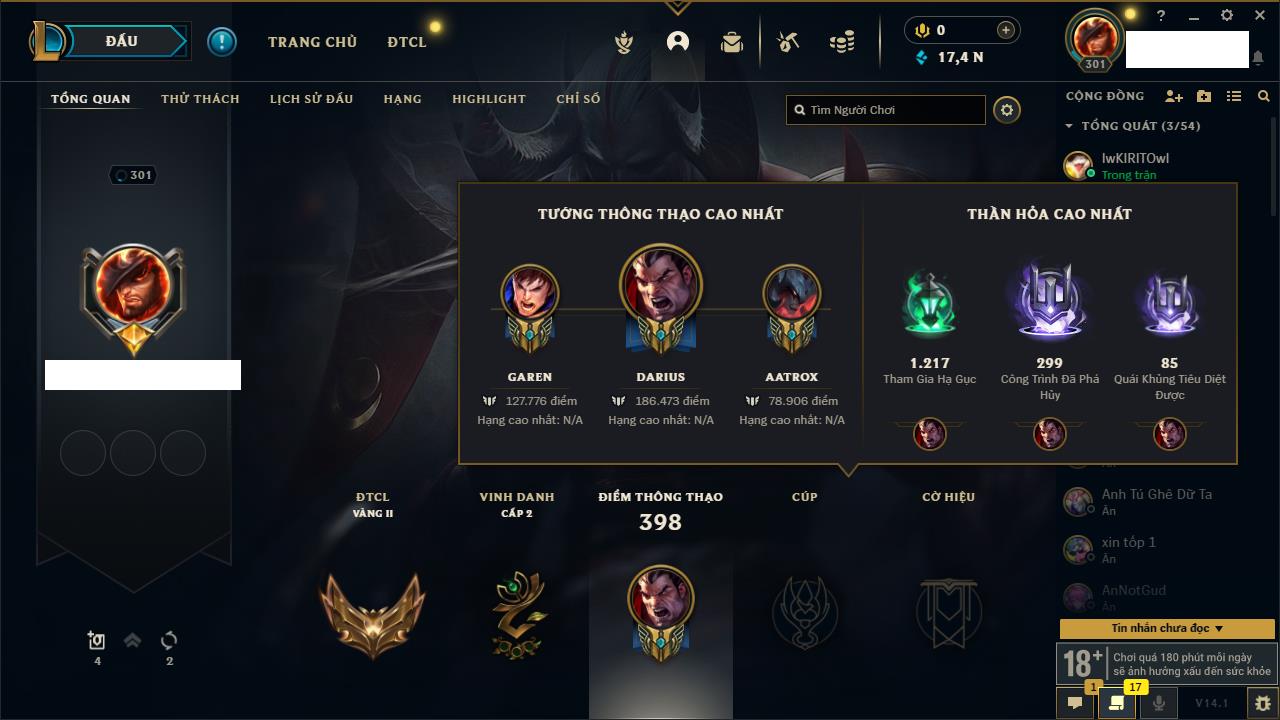 Rank Đơn: Chưa RankKhung: SắtTướng: 148 - Còn 2999 THXTrang Phục: 139Rank ĐTCL: Chưa RankLinh Thú: 43
