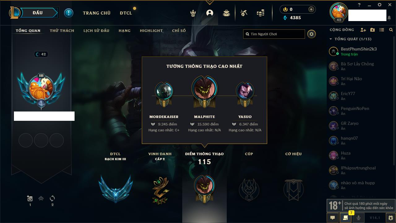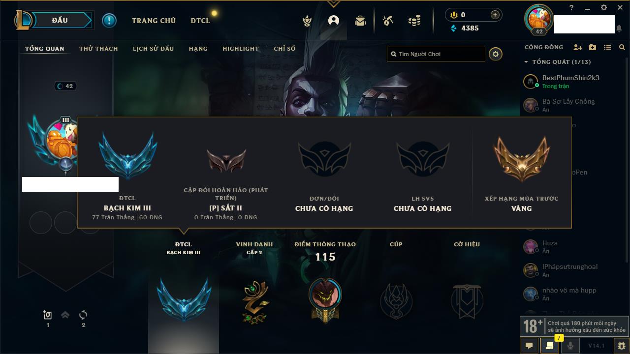 Rank Đơn: Sắt IIIKhung: Chưa có khungTướng: 77 - Còn 8133 THXTrang Phục: 11Rank ĐTCL: Bạch Kim IVLinh Thú: 108