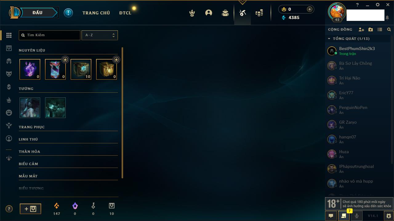 Rank Đơn: Sắt IIIKhung: Chưa có khungTướng: 88 - Còn 1376 THXTrang Phục: 12Rank ĐTCL: Bạc IVLinh Thú: 69