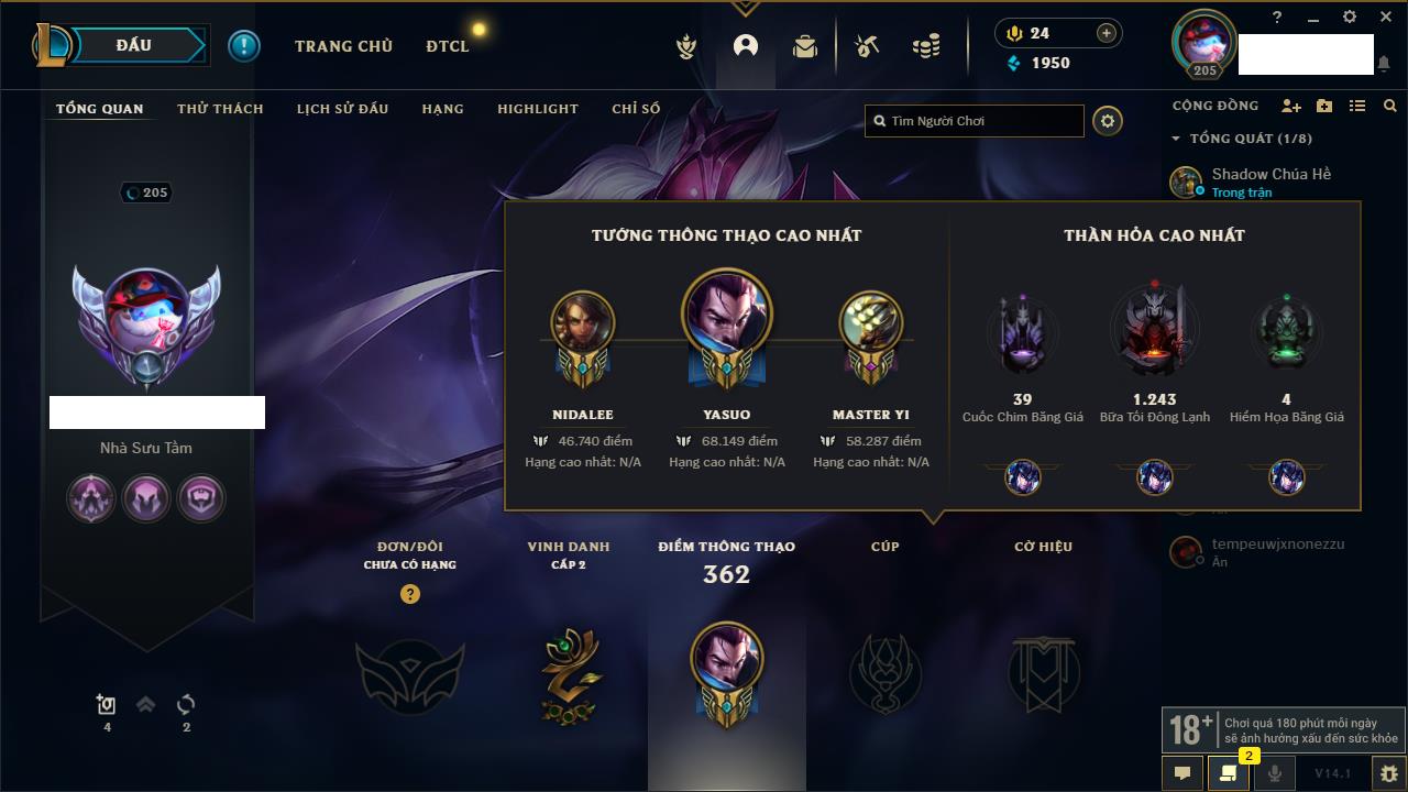 Rank Đơn: Vàng IVKhung: BạcTướng: 167 - Còn 16342 THXTrang Phục: 159Rank ĐTCL: Chưa RankLinh Thú: 88
