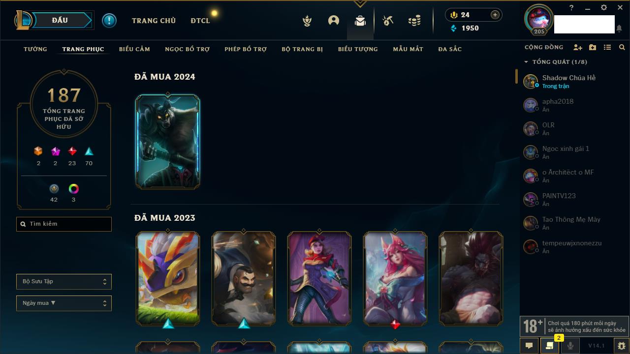 Rank Đơn: Bạc IIIKhung: BạcTướng: 170 - Còn 26893 THXTrang Phục: 142Rank ĐTCL: Chưa RankLinh Thú: 135