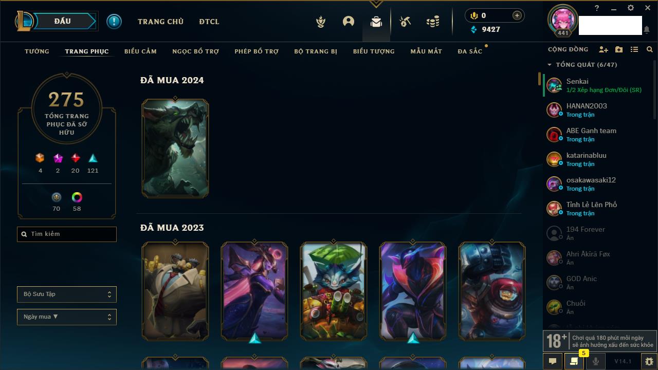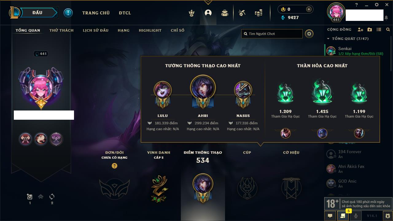 Rank Đơn: Chưa RankKhung: Bạch kimTướng: 172 - Còn 81 THXTrang Phục: 226Rank ĐTCL: Chưa RankLinh Thú: 193