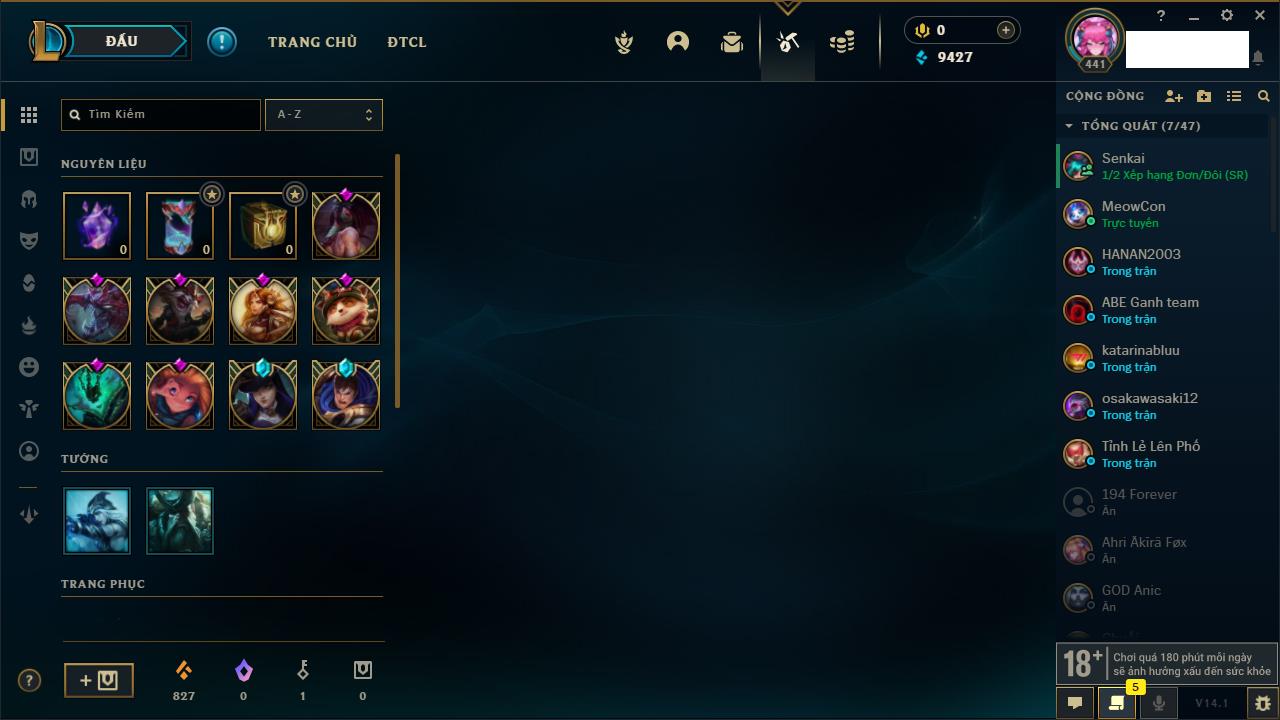 Rank Đơn: Chưa RankKhung: VàngTướng: 171 - Còn 489498 THXTrang Phục: 263Rank ĐTCL: Chưa RankLinh Thú: 39
