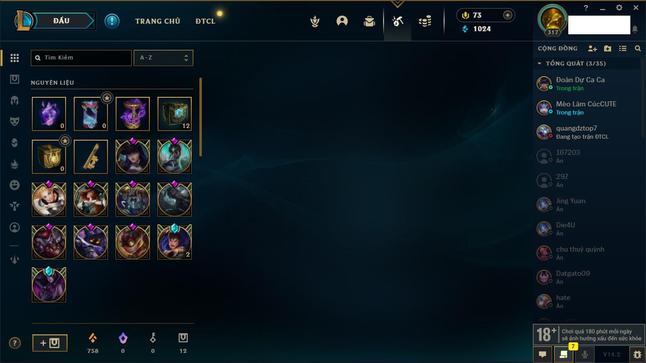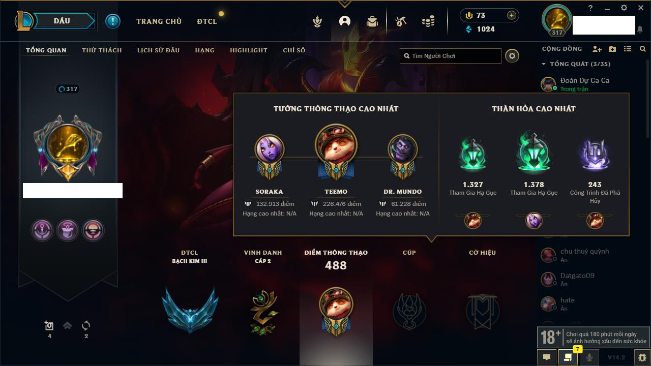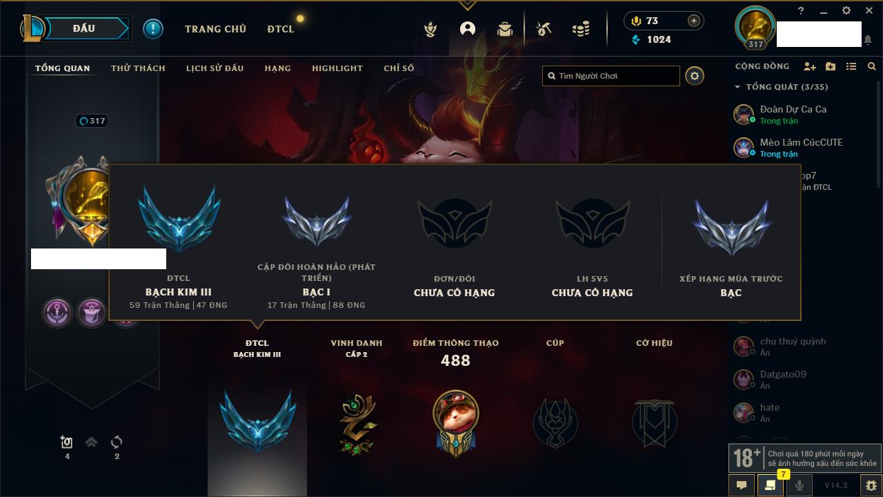 Rank Đơn: Chưa RankKhung: Bạch kimTướng: 171 - Còn 182788 THXTrang Phục: 158Rank ĐTCL: Chưa RankLinh Thú: 56