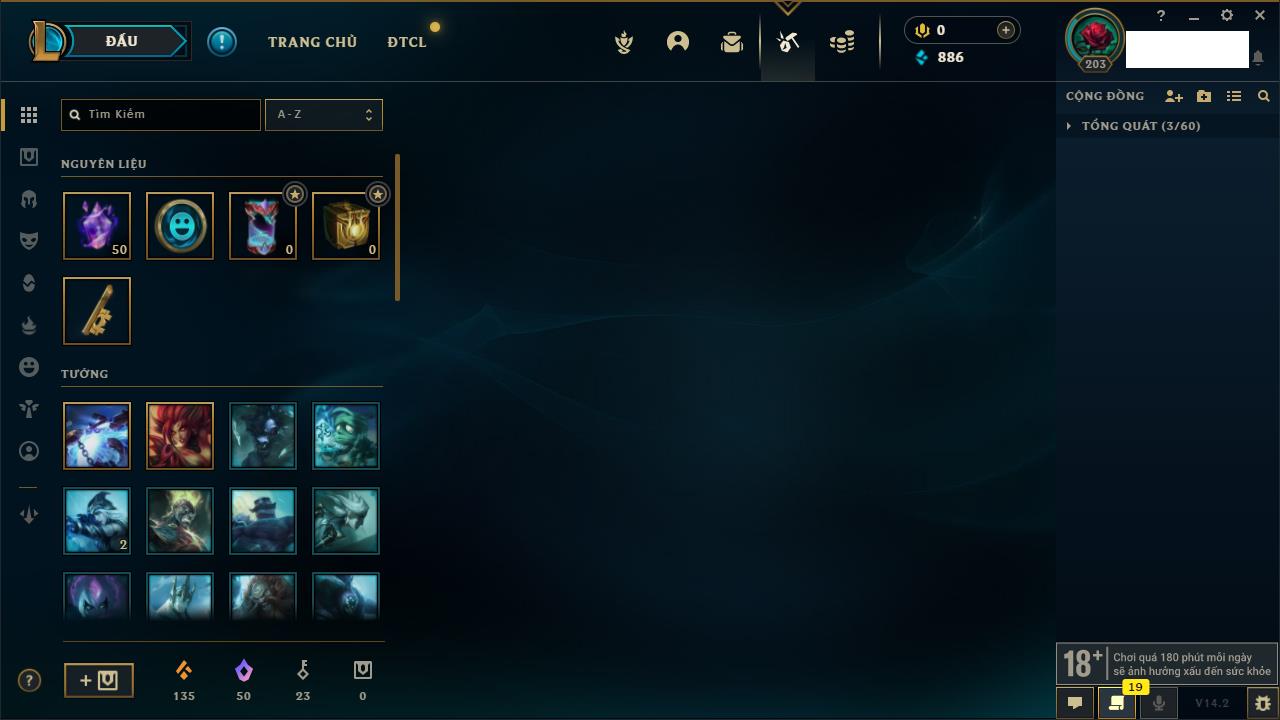 Rank Đơn: Đồng IKhung: Chưa có khungTướng: 171 - Còn 223932 THXTrang Phục: 61Rank ĐTCL: Lục Bảo ILinh Thú: 58
