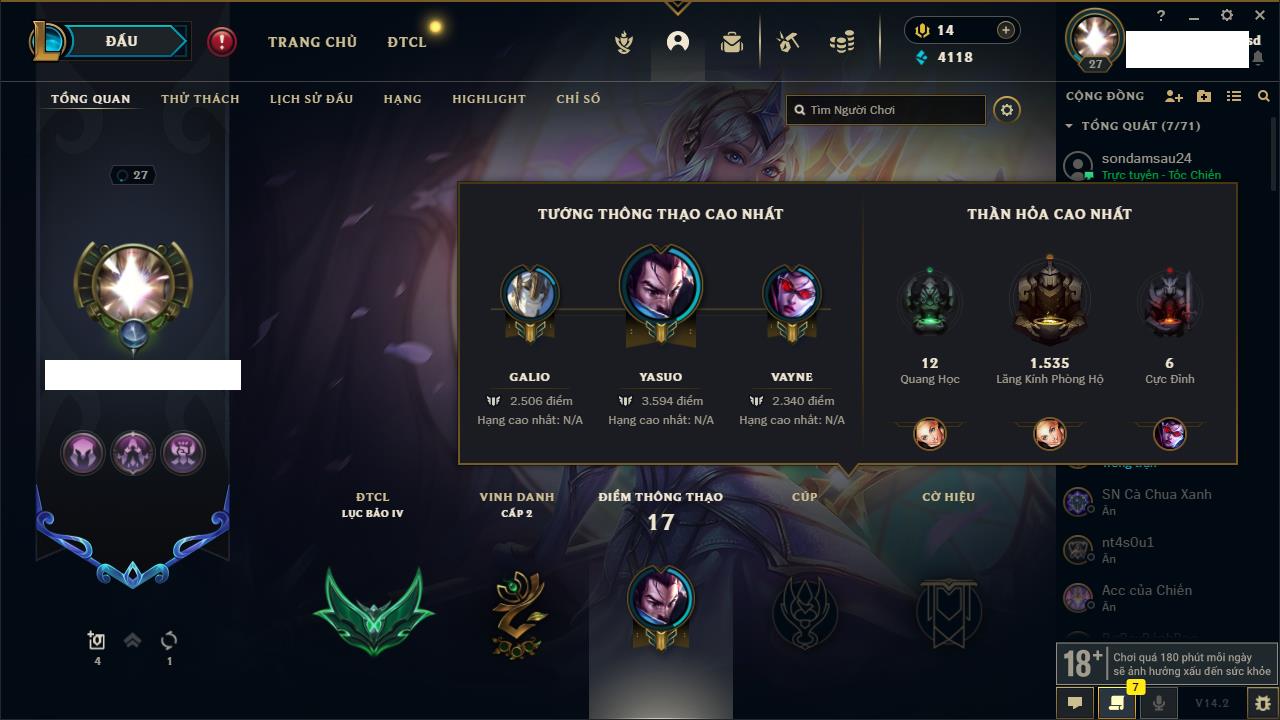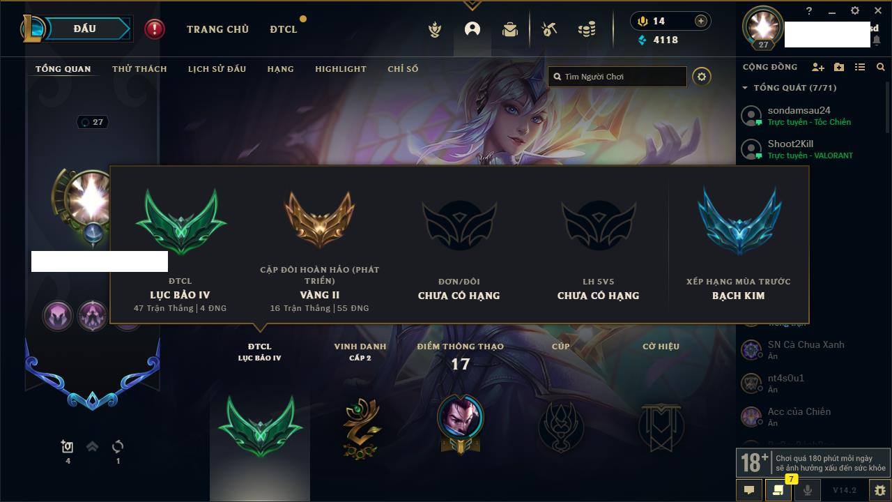 Rank Đơn: Chưa rank mùa nàoKhung: Chưa có khungTướng: 156 - Còn 18550 THXTrang Phục: 4Rank ĐTCL: Chưa RankLinh Thú: 75