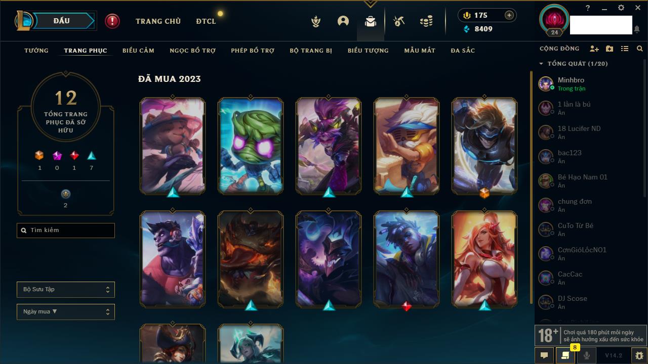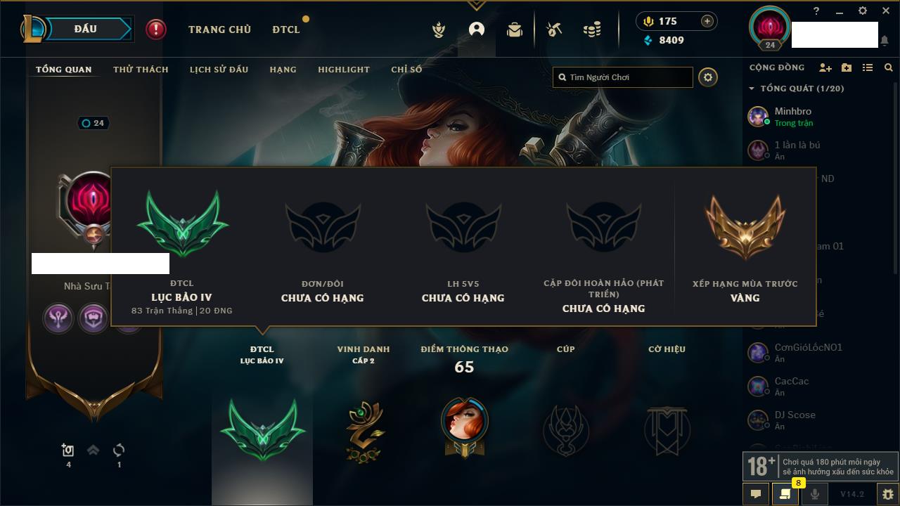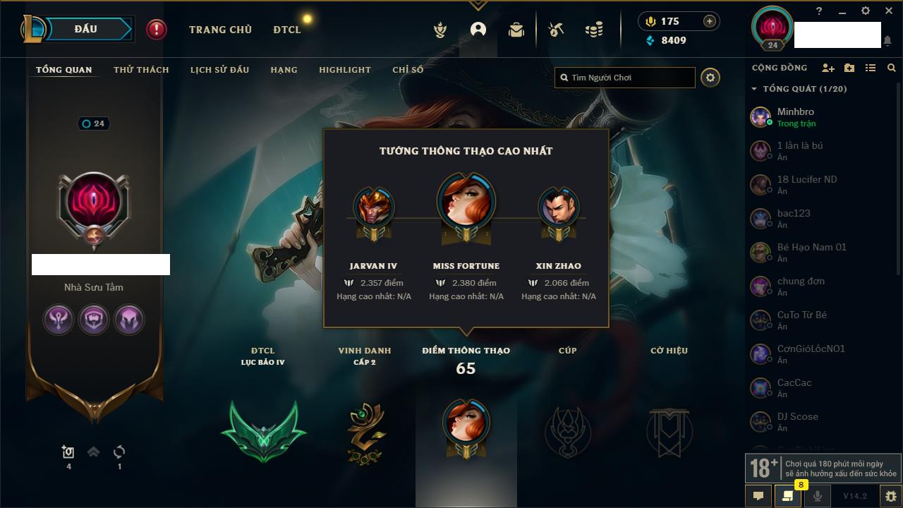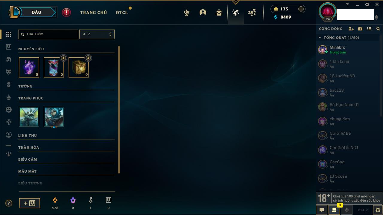Rank Đơn: Chưa rank mùa nàoKhung: Chưa có khungTướng: 157 - Còn 8409 THXTrang Phục: 12Rank ĐTCL: Chưa RankLinh Thú: 74