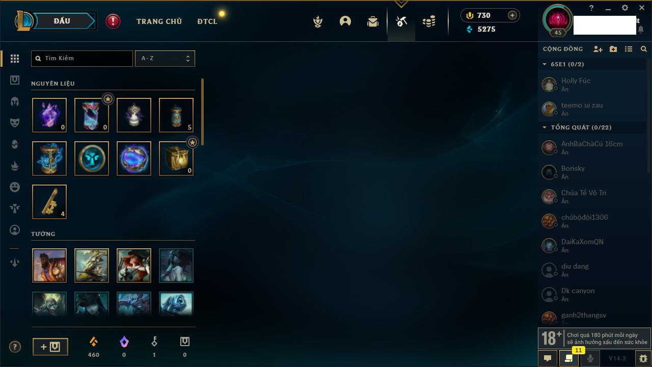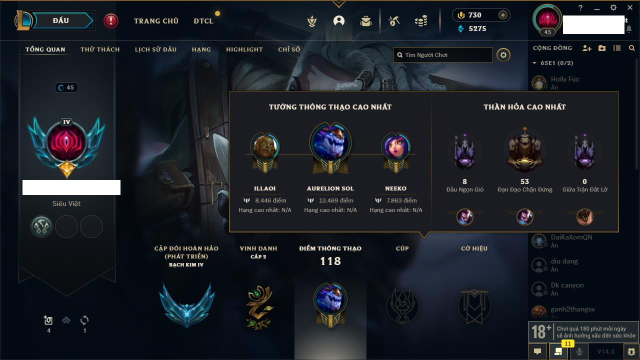 Rank Đơn: Chưa rank mùa nàoKhung: Chưa có khungTướng: 4 - Còn 30300 THXTrang Phục: 0Rank ĐTCL: Bạch Kim IVLinh Thú: 36