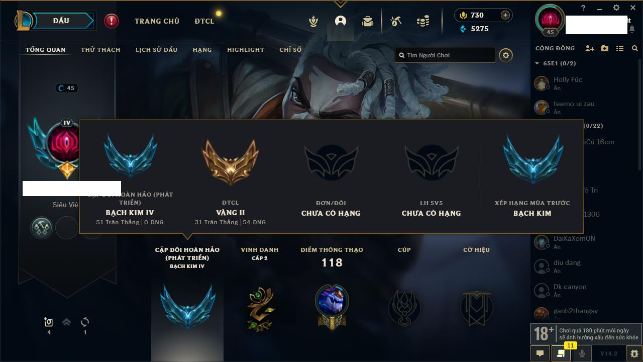 Rank Đơn: Đồng IIKhung: ĐồngTướng: 172 - Còn 35937 THXTrang Phục: 81Rank ĐTCL: Chưa RankLinh Thú: 38