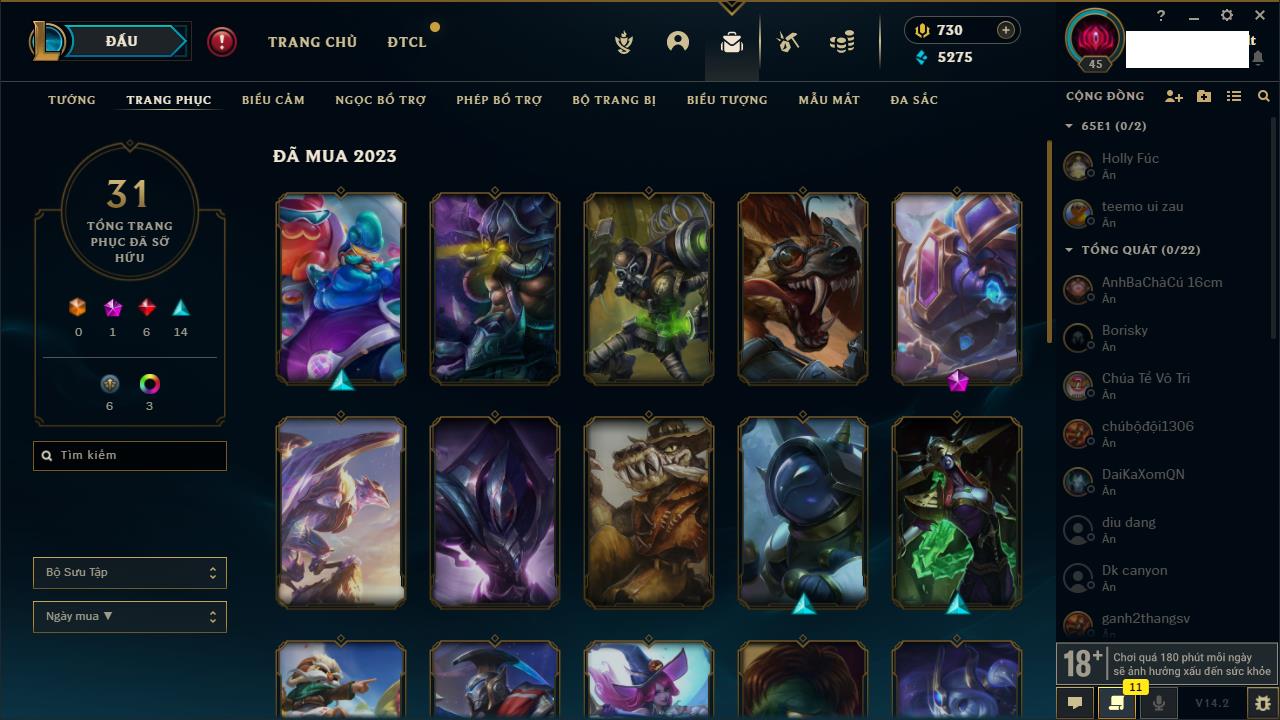 Rank Đơn: Chưa RankKhung: Chưa có khungTướng: 157 - Còn 6232 THXTrang Phục: 60Rank ĐTCL: Chưa RankLinh Thú: 89