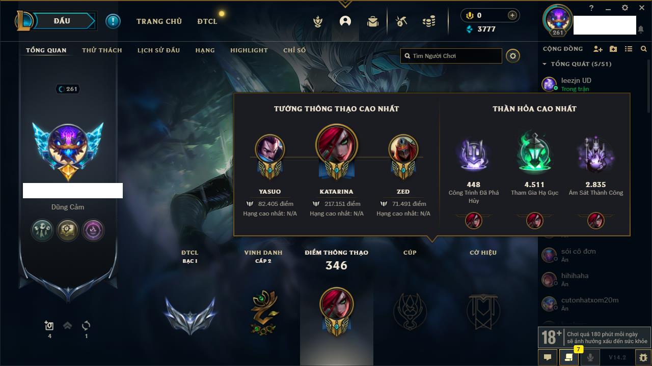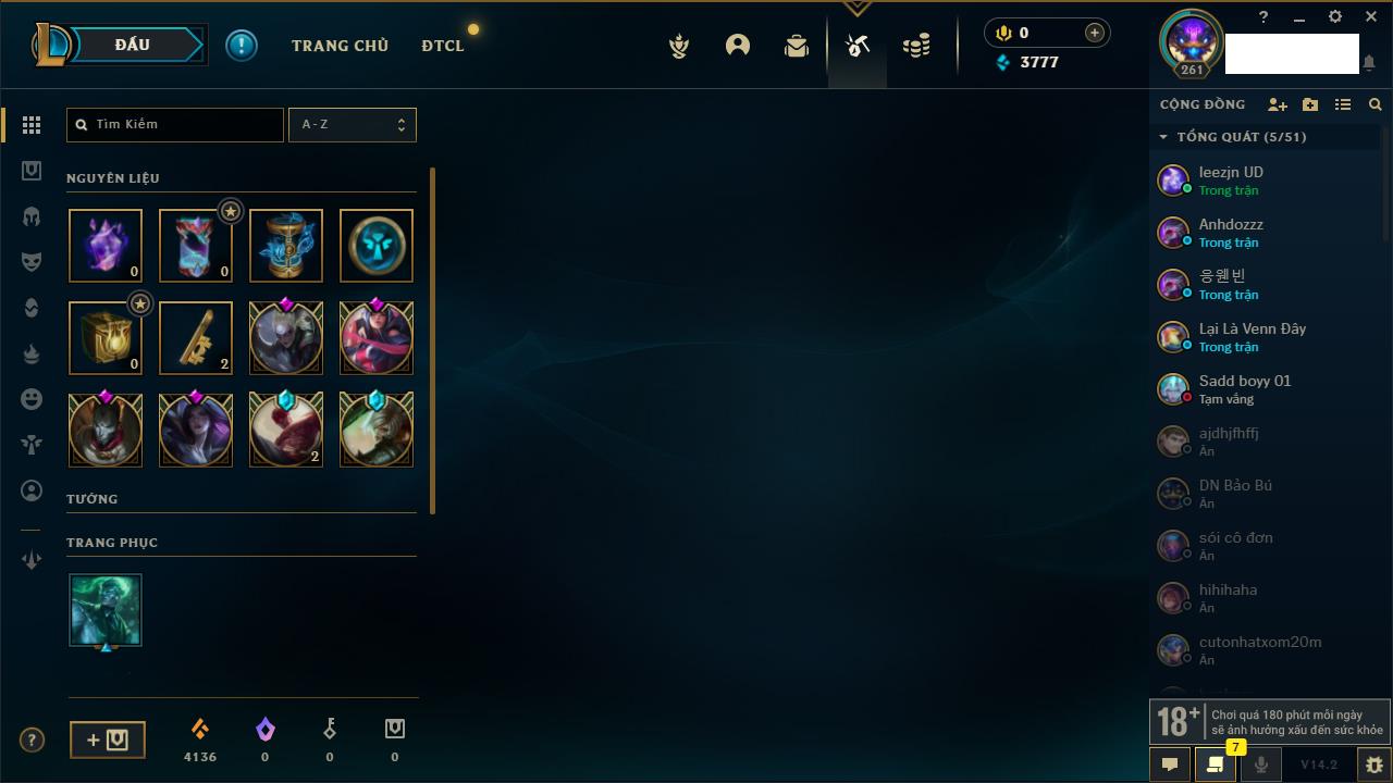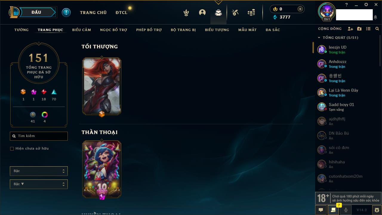 Rank Đơn: Bạch Kim IVKhung: Bạch kimTướng: 151 - Còn 16486 THXTrang Phục: 62Rank ĐTCL: Chưa RankLinh Thú: 12