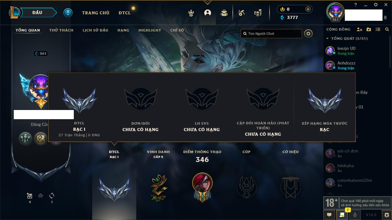 Rank Đơn: Bạch Kim IIIKhung: ĐồngTướng: 131 - Còn 3780 THXTrang Phục: 53Rank ĐTCL: Chưa RankLinh Thú: 4
