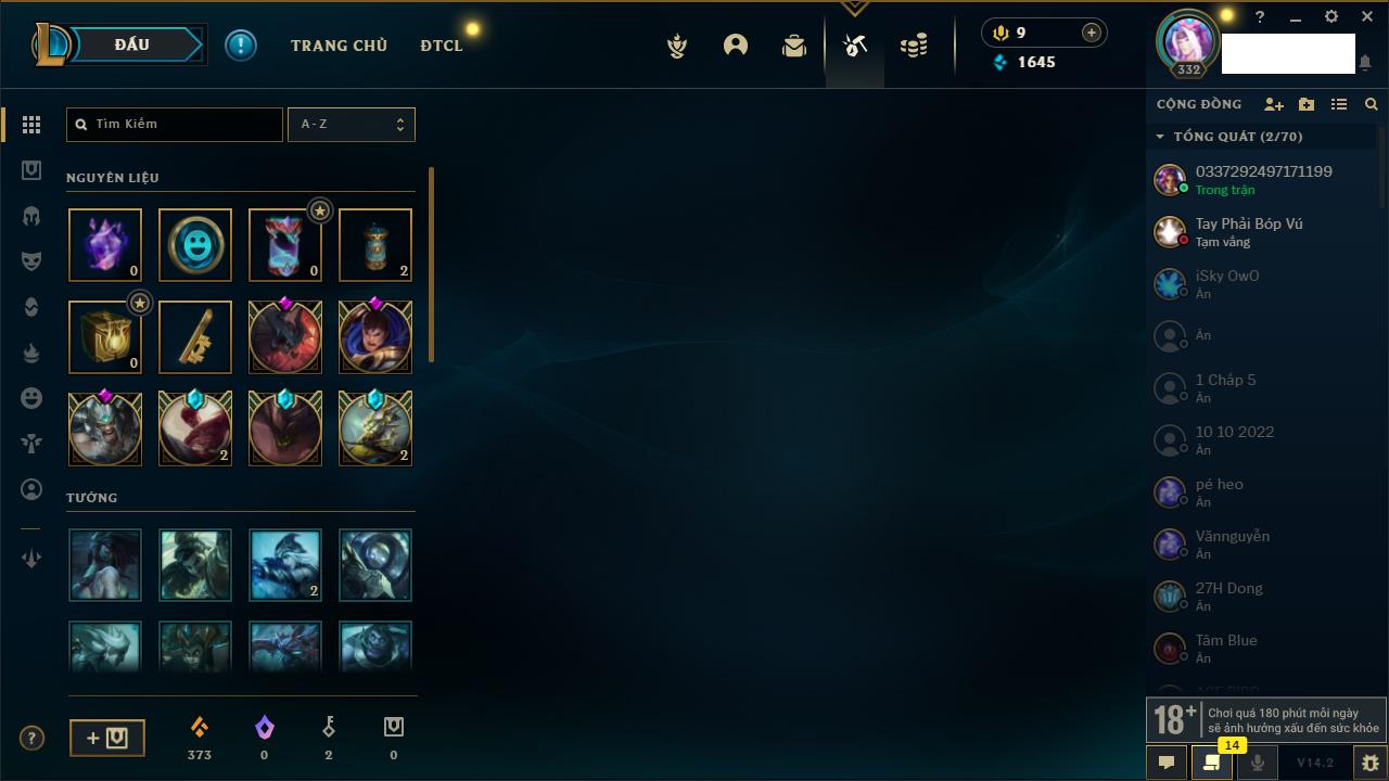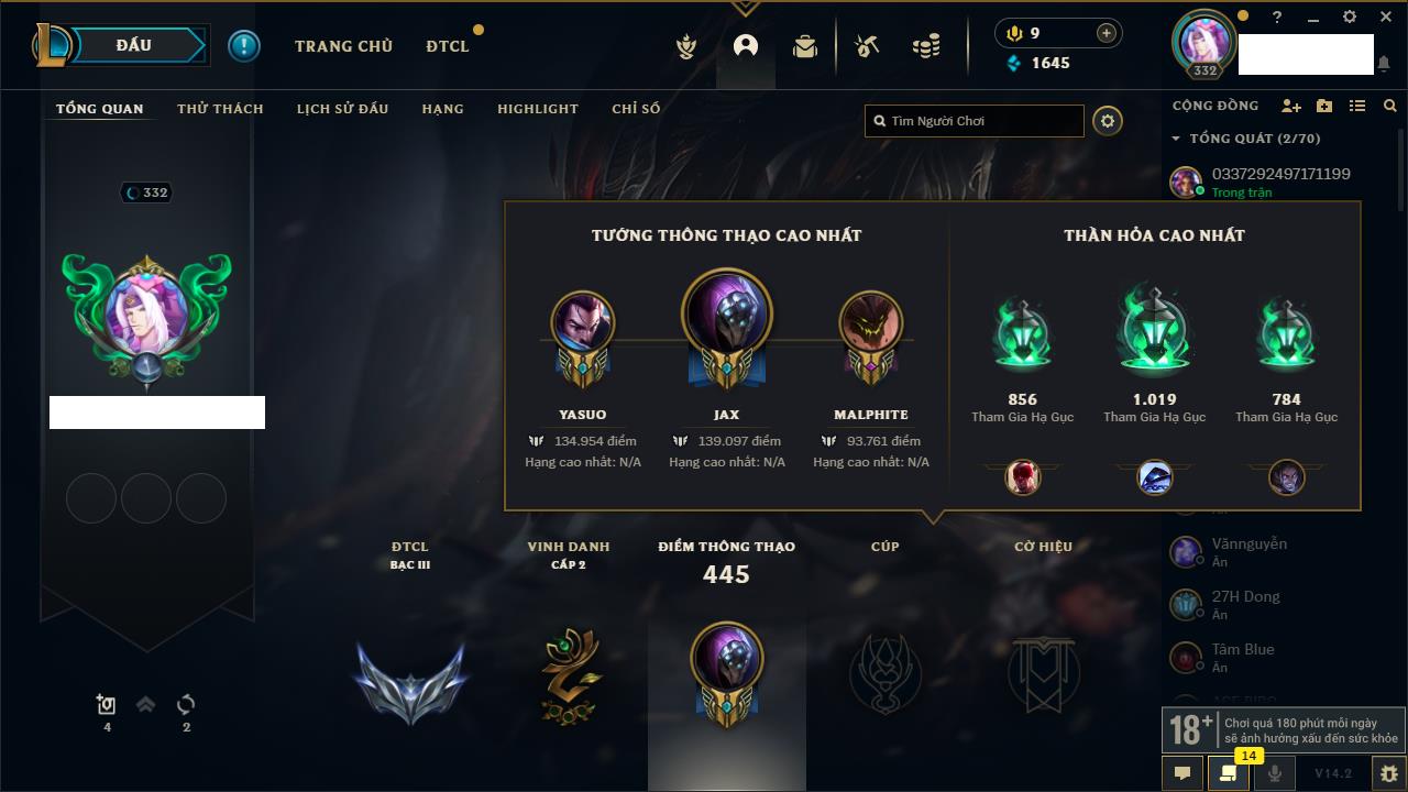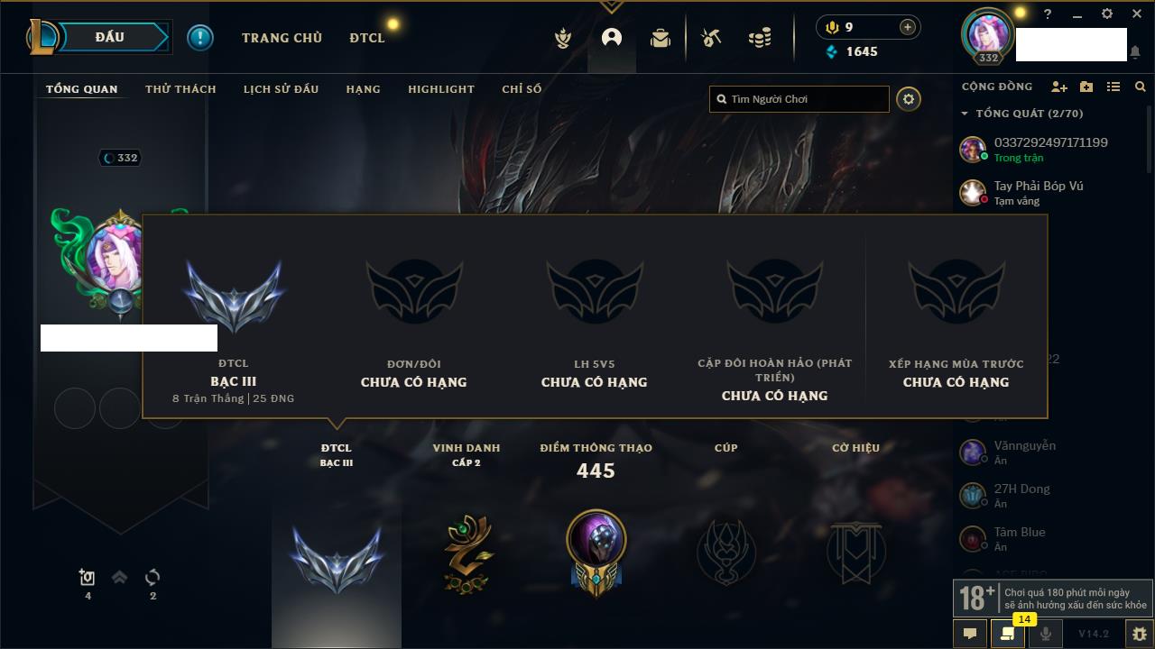 Rank Đơn: Vàng IKhung: BạcTướng: 171 - Còn 60584 THXTrang Phục: 286Rank ĐTCL: Vàng IIILinh Thú: 117