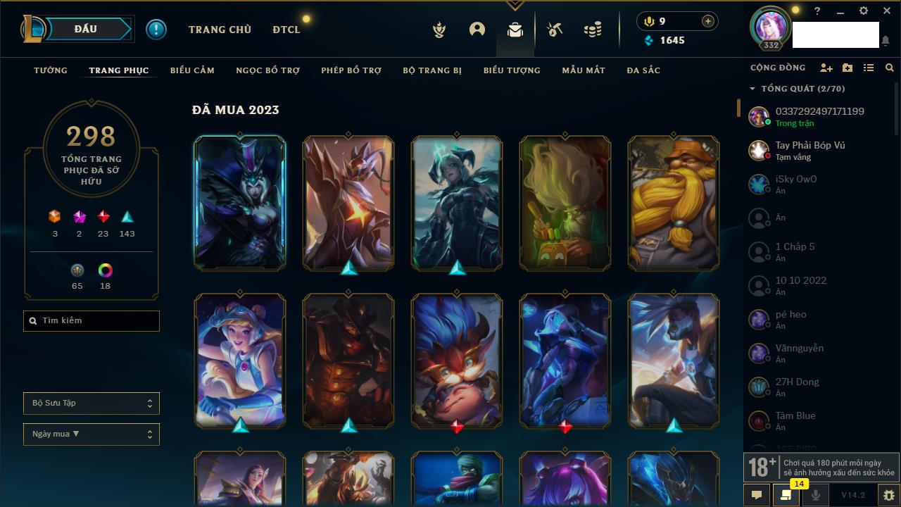 Rank Đơn: Vàng IIIKhung: VàngTướng: 171 - Còn 88128 THXTrang Phục: 329Rank ĐTCL: Chưa RankLinh Thú: 41
