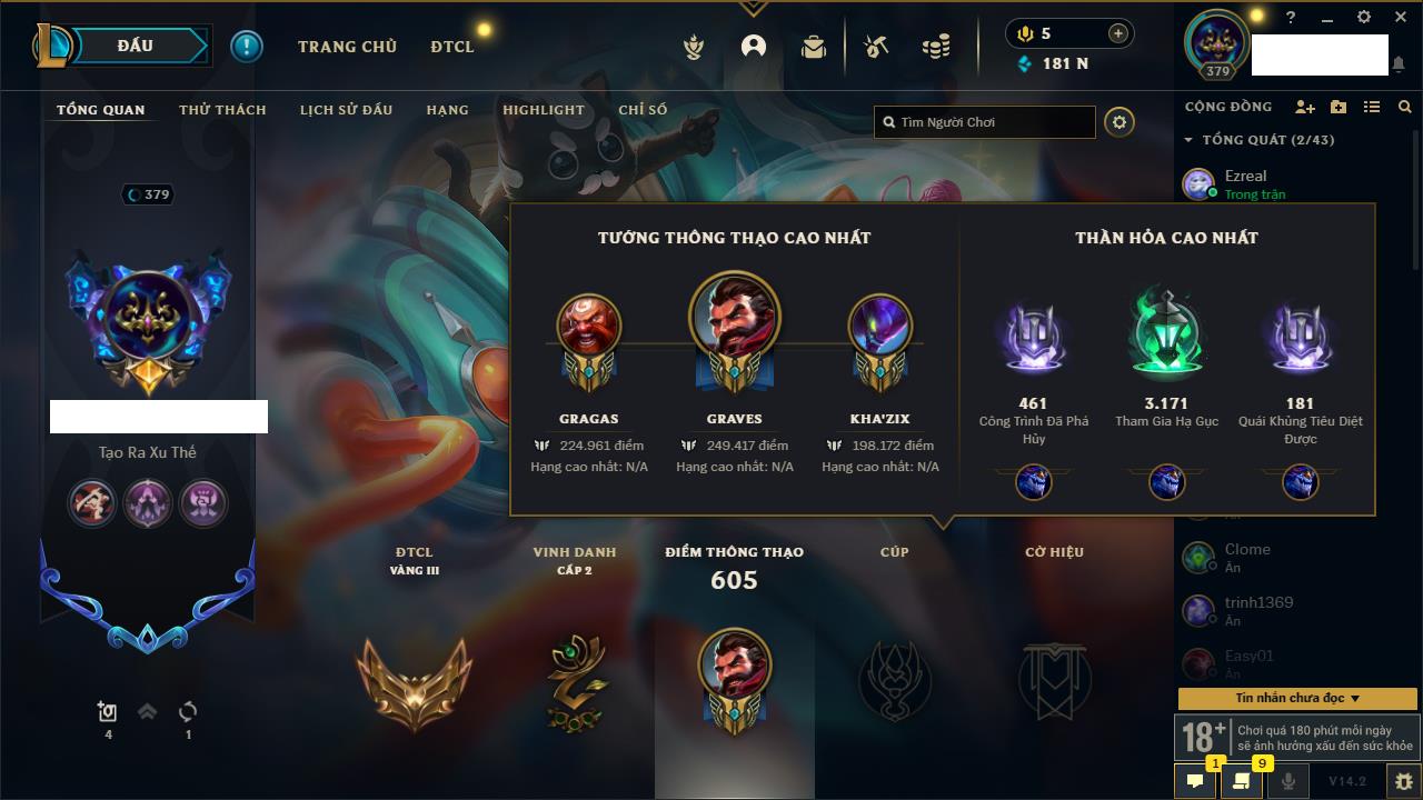 Rank Đơn: Chưa RankKhung: Bạch kimTướng: 86 - Còn 1608 THXTrang Phục: 47Rank ĐTCL: Chưa RankLinh Thú: 58