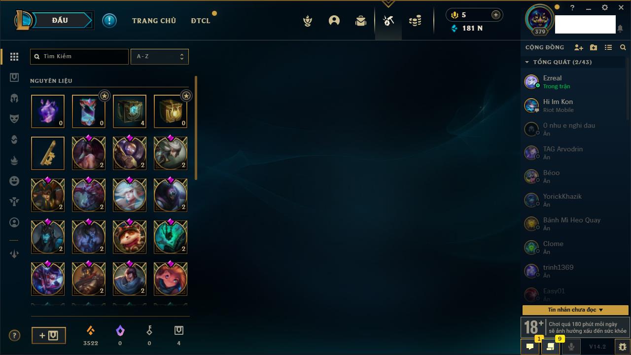 Rank Đơn: Chưa RankKhung: Chưa có khungTướng: 170 - Còn 14503 THXTrang Phục: 180Rank ĐTCL: Chưa RankLinh Thú: 131