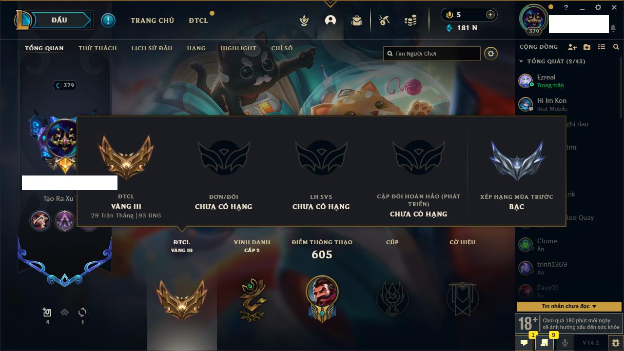 Rank Đơn: Chưa RankKhung: BạcTướng: 171 - Còn 60553 THXTrang Phục: 273Rank ĐTCL: Chưa RankLinh Thú: 146