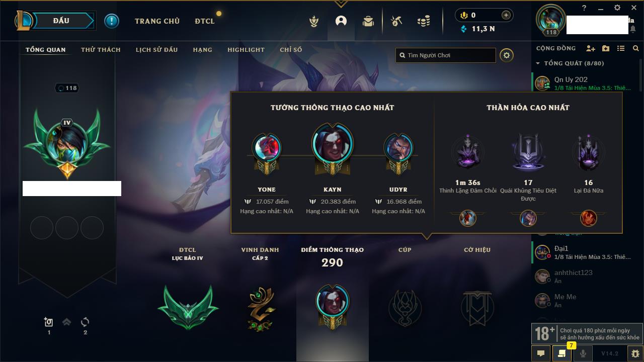 Rank Đơn: Đồng IIKhung: ĐồngTướng: 172 - Còn 35937 THXTrang Phục: 81Rank ĐTCL: Chưa RankLinh Thú: 38