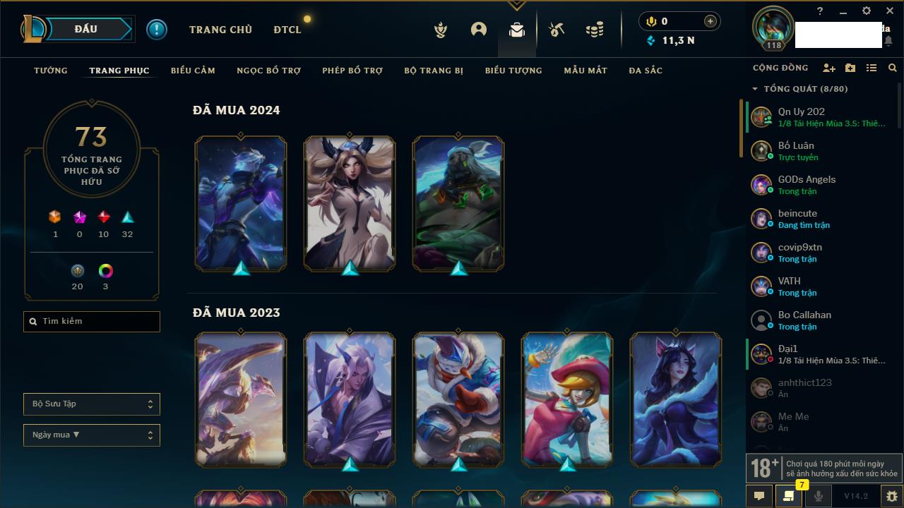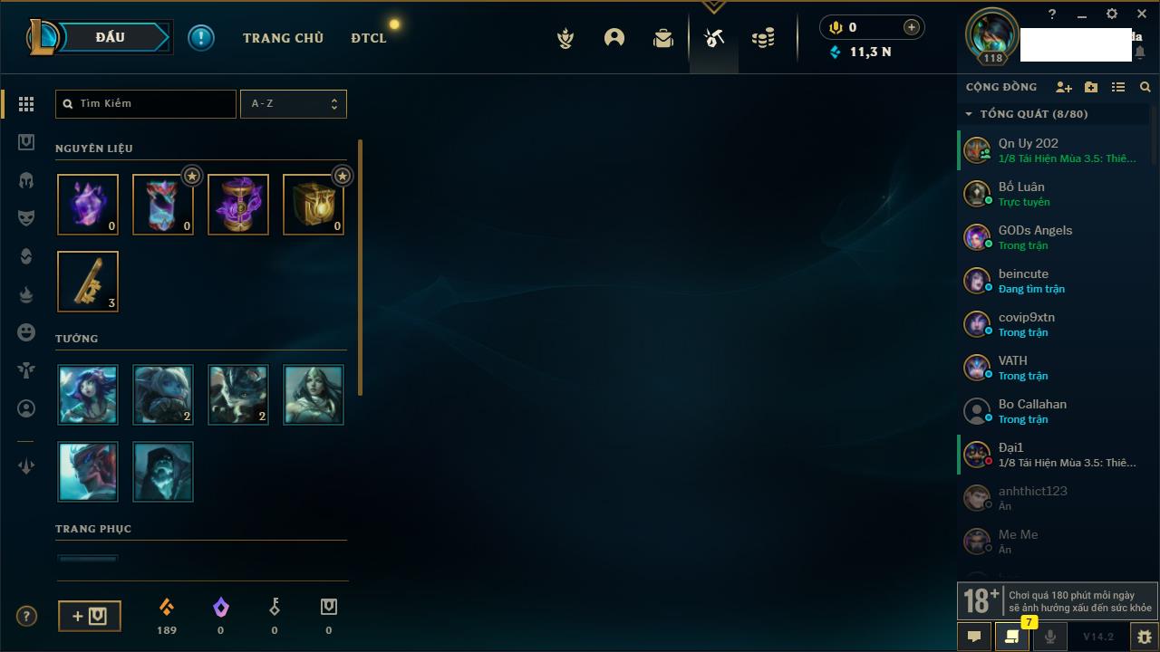 Rank Đơn: Chưa RankKhung: Chưa có khungTướng: 157 - Còn 6232 THXTrang Phục: 60Rank ĐTCL: Chưa RankLinh Thú: 89