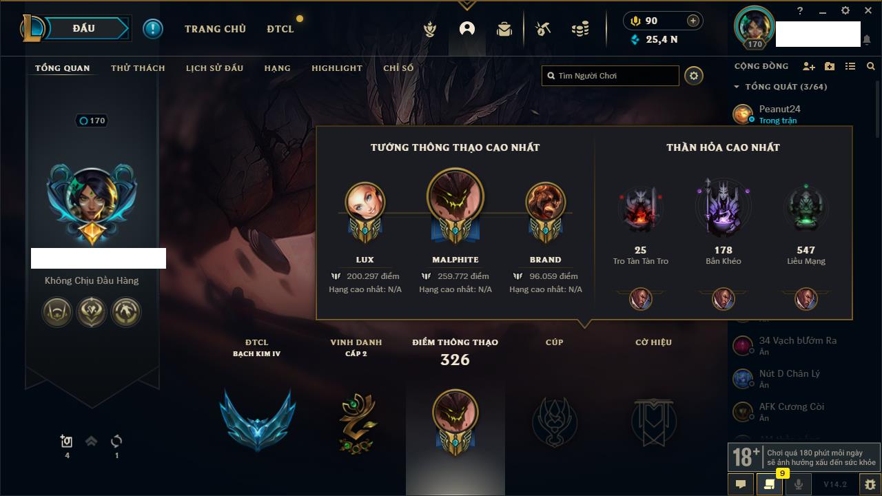 Rank Đơn: Đồng IIKhung: Chưa có khungTướng: 153 - Còn 32832 THXTrang Phục: 66Rank ĐTCL: Chưa RankLinh Thú: 7