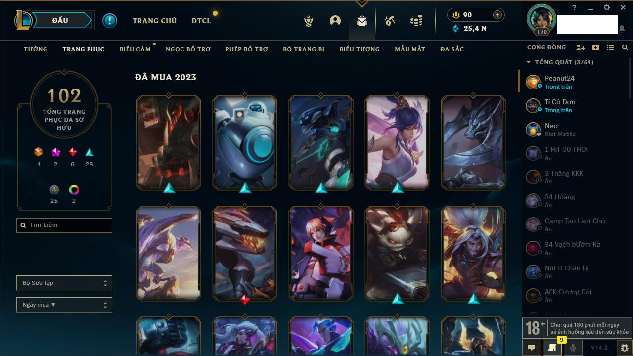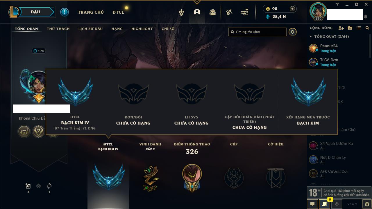 Rank Đơn: Chưa RankKhung: Chưa có khungTướng: 162 - Còn 25420 THXTrang Phục: 102Rank ĐTCL: Chưa RankLinh Thú: 78