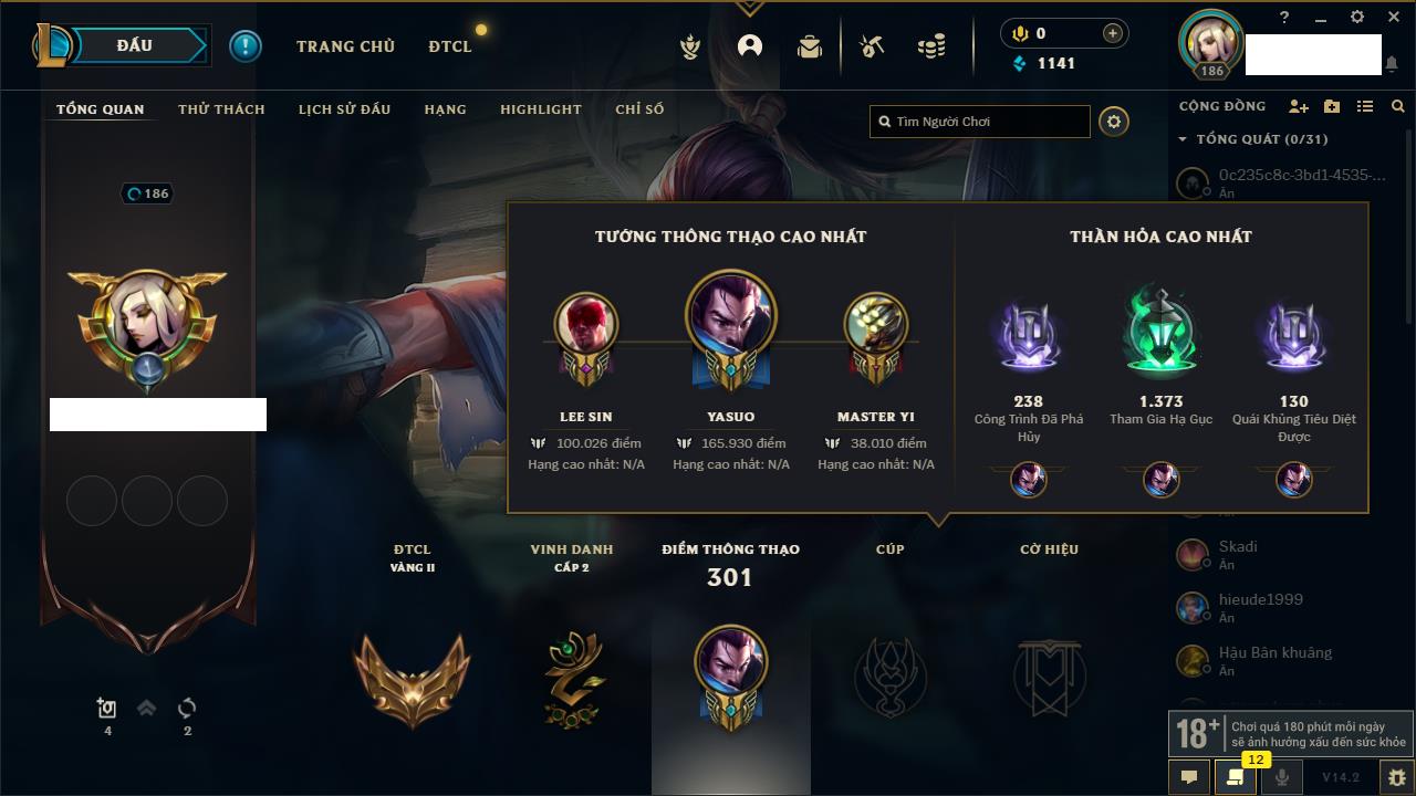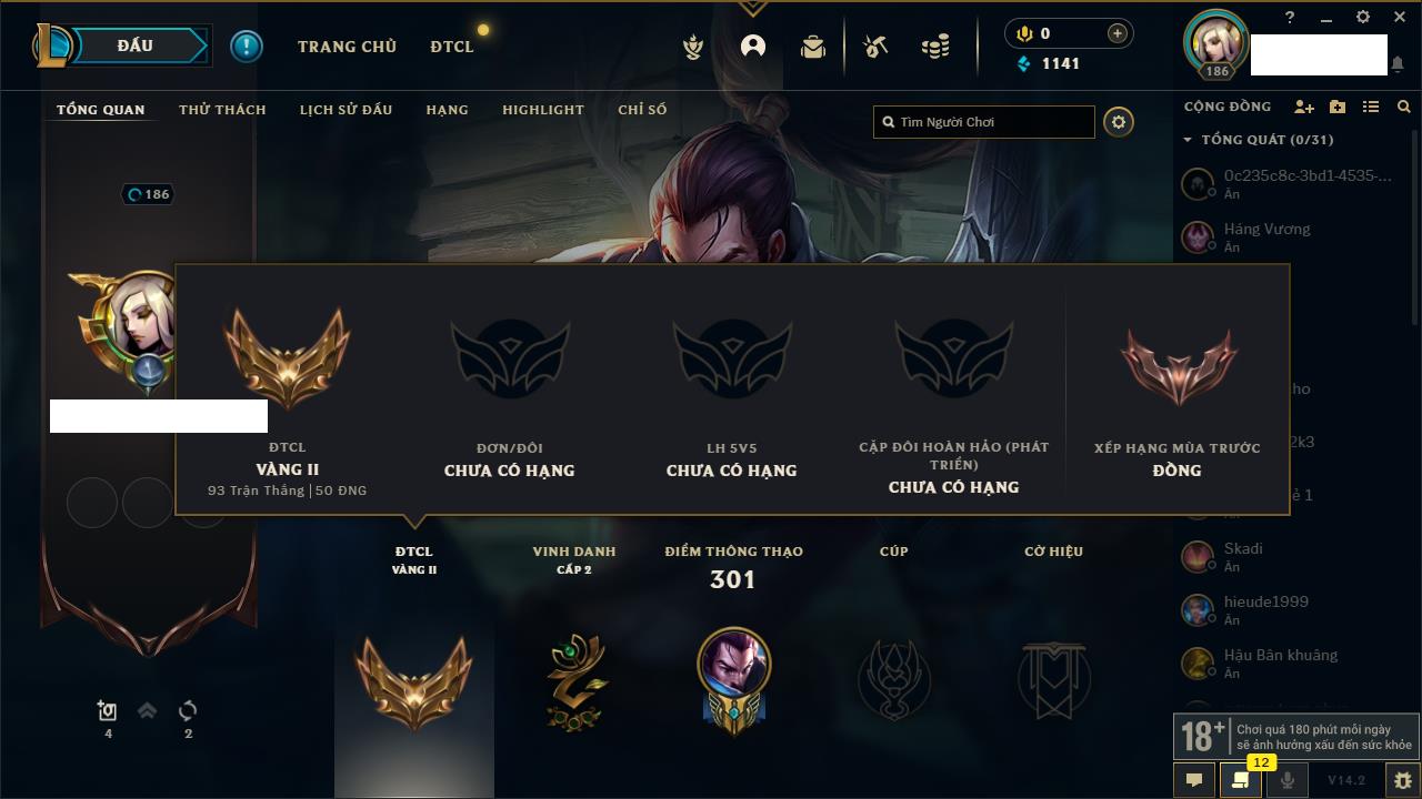 Rank Đơn: Đồng IIKhung: Chưa có khungTướng: 153 - Còn 32832 THXTrang Phục: 66Rank ĐTCL: Chưa RankLinh Thú: 7