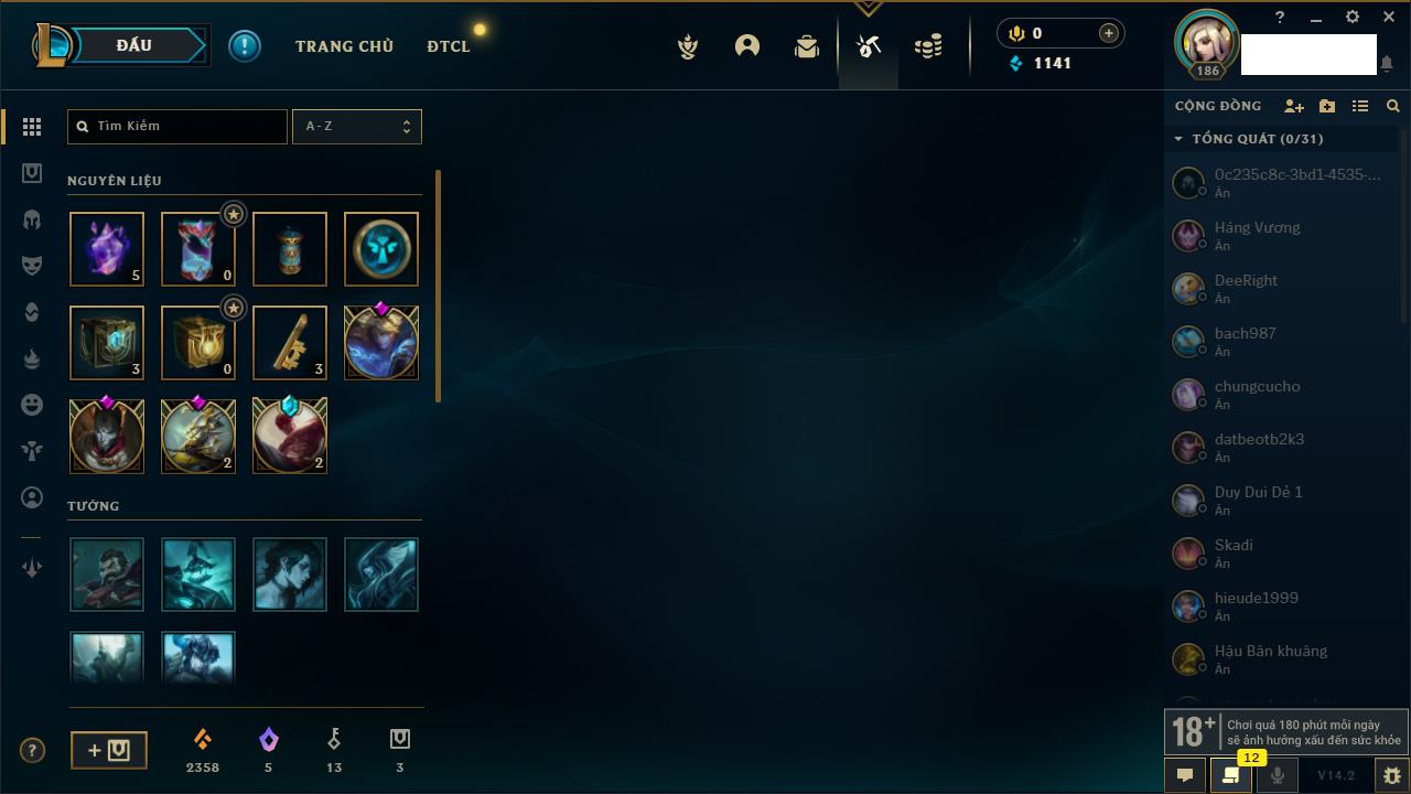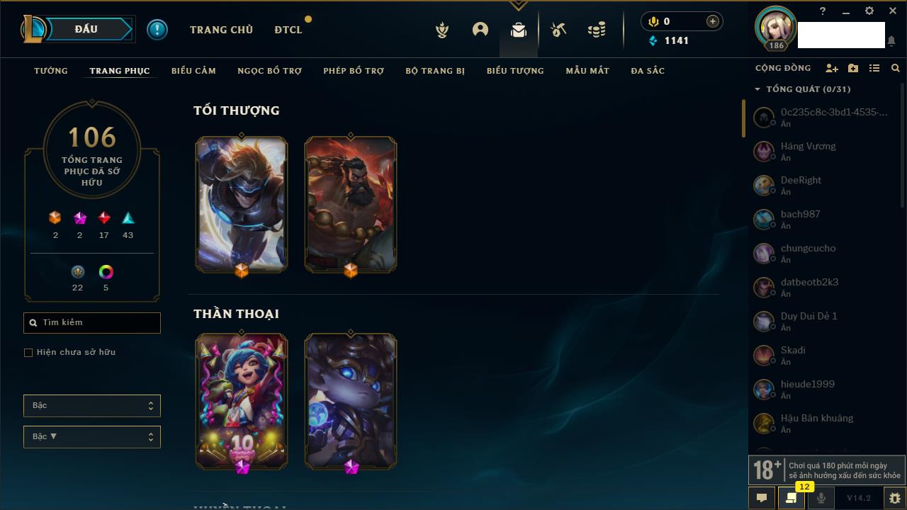 Rank Đơn: Chưa RankKhung: Chưa có khungTướng: 166 - Còn 8843 THXTrang Phục: 120Rank ĐTCL: Chưa RankLinh Thú: 33
