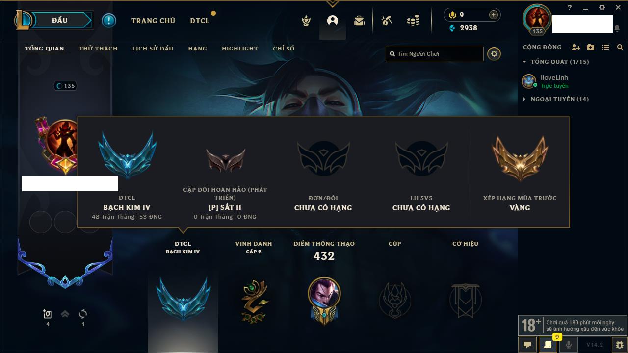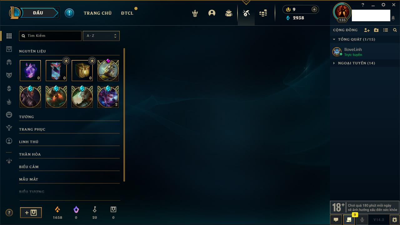 Rank Đơn: Đồng IIKhung: Chưa có khungTướng: 153 - Còn 32832 THXTrang Phục: 66Rank ĐTCL: Chưa RankLinh Thú: 7