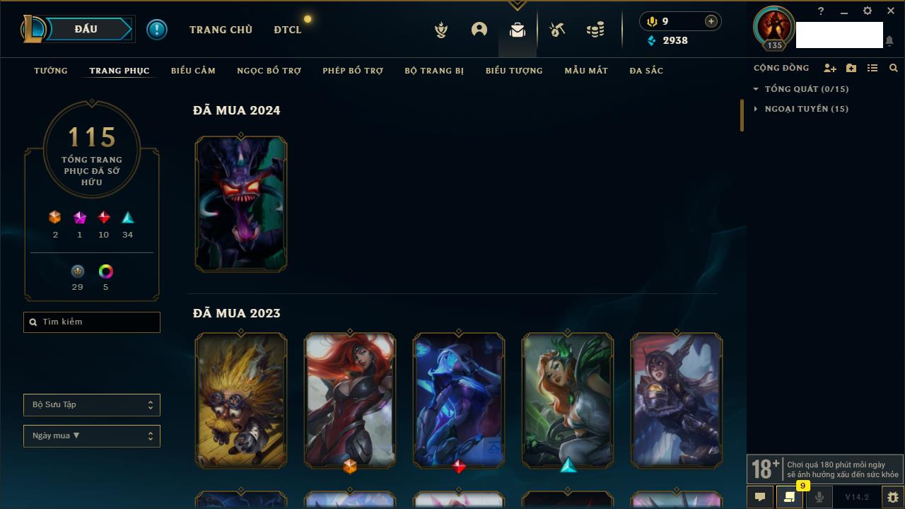 Rank Đơn: Chưa RankKhung: Chưa có khungTướng: 164 - Còn 2938 THXTrang Phục: 115Rank ĐTCL: Chưa RankLinh Thú: 56