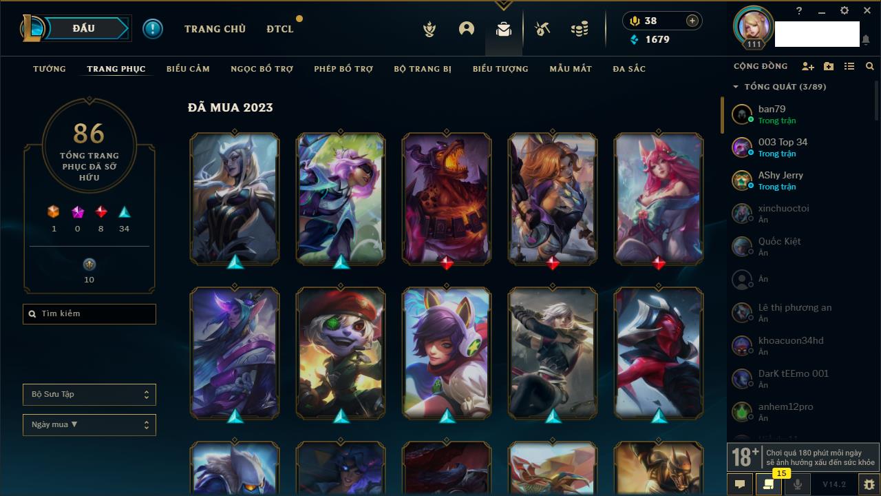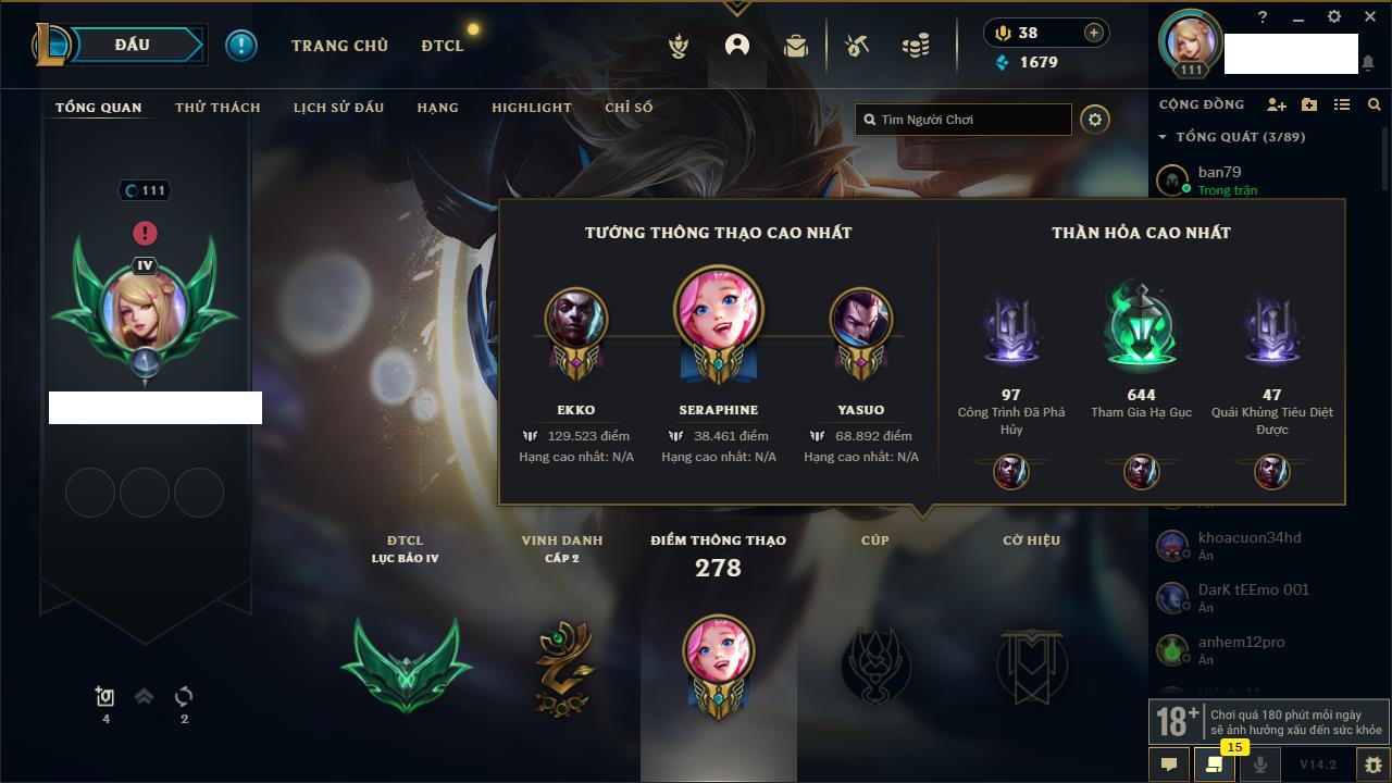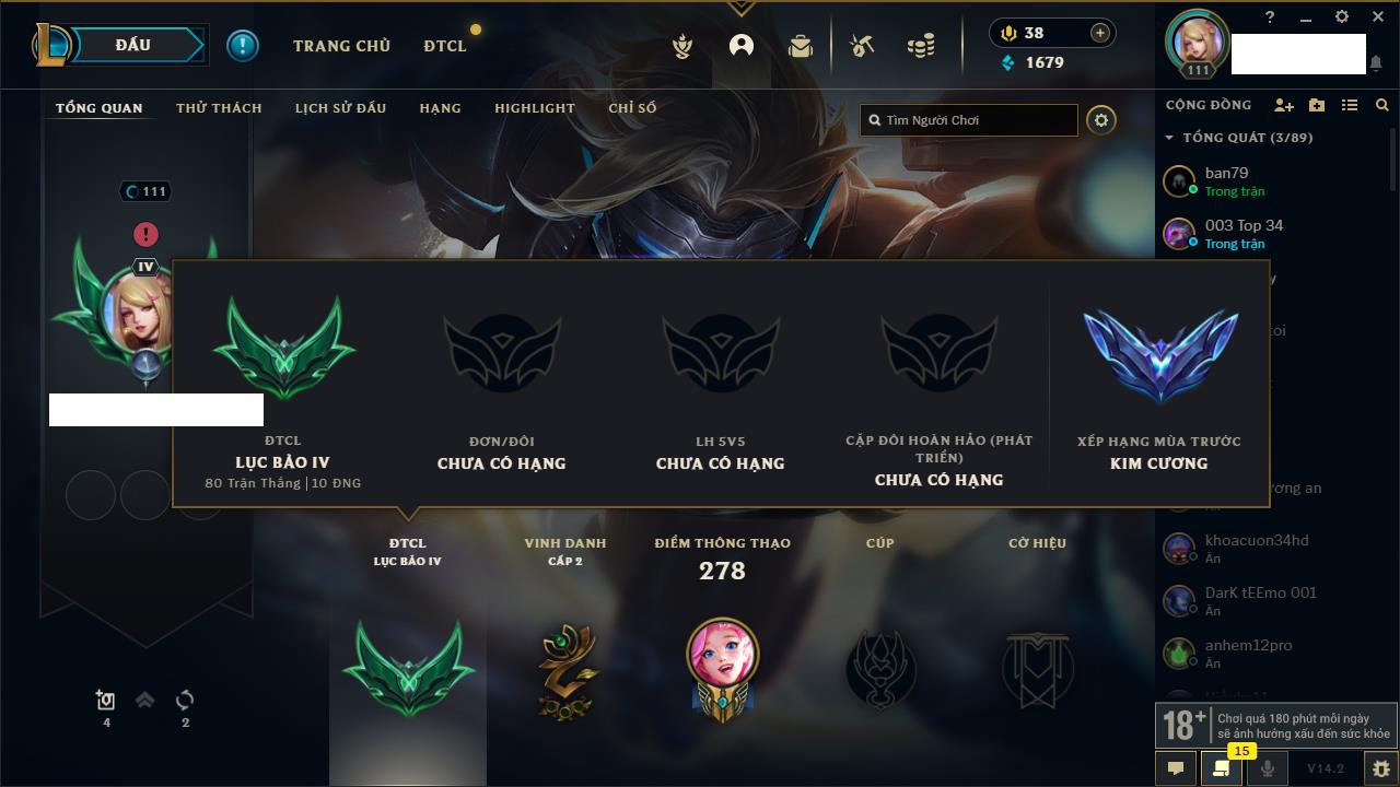 Rank Đơn: Đồng IKhung: Chưa có khungTướng: 130 - Còn 4038 THXTrang Phục: 151Rank ĐTCL: Chưa RankLinh Thú: 45