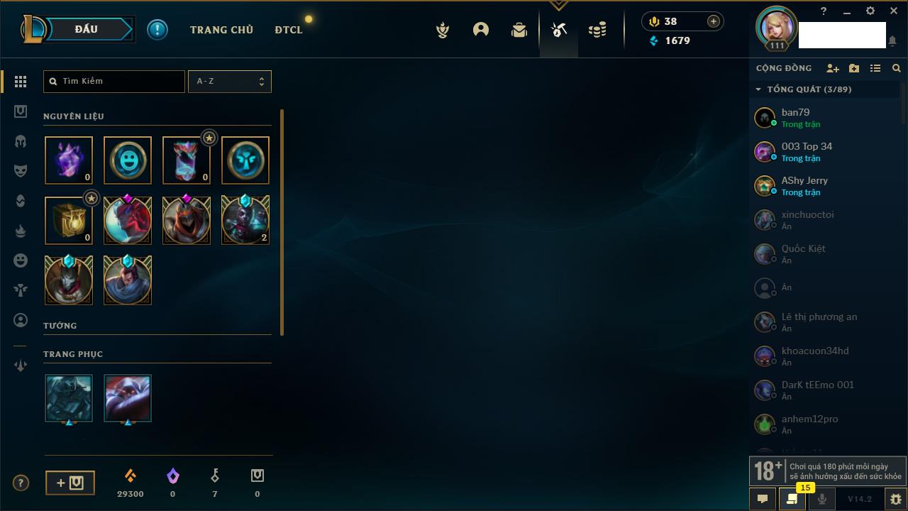 Rank Đơn: Chưa RankKhung: Chưa có khungTướng: 76 - Còn 3157 THXTrang Phục: 7Rank ĐTCL: Chưa RankLinh Thú: 100
