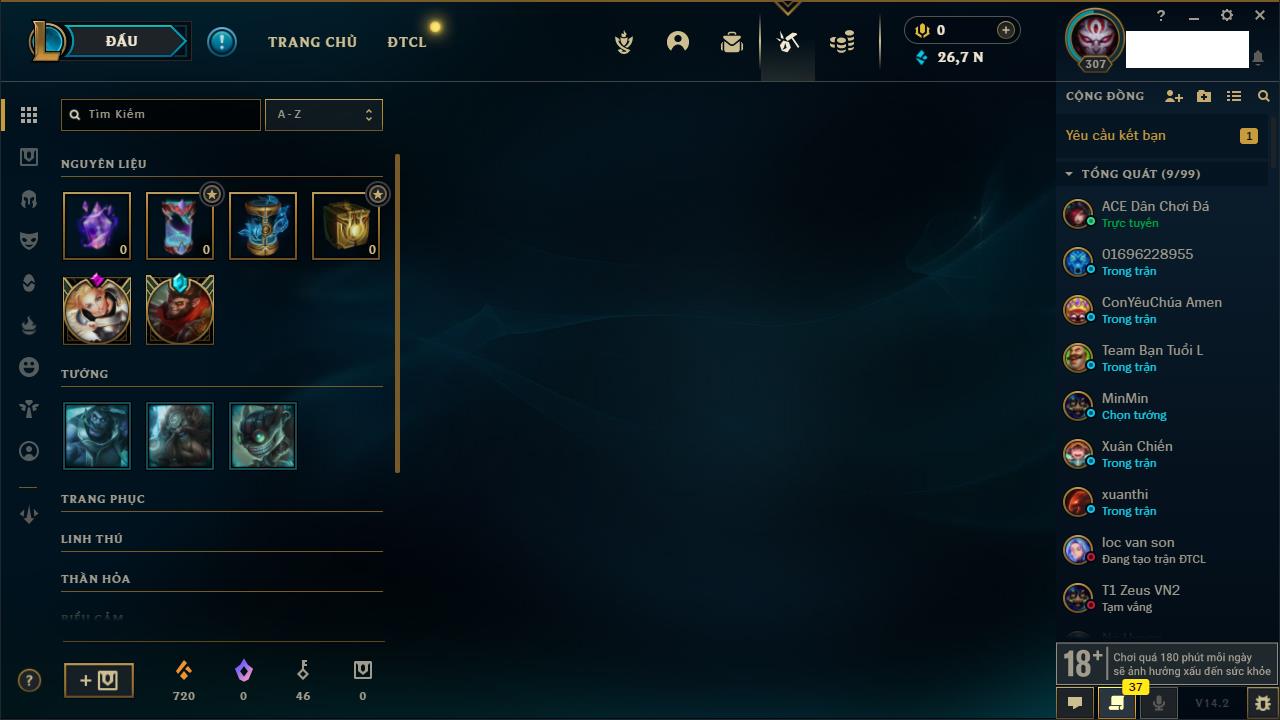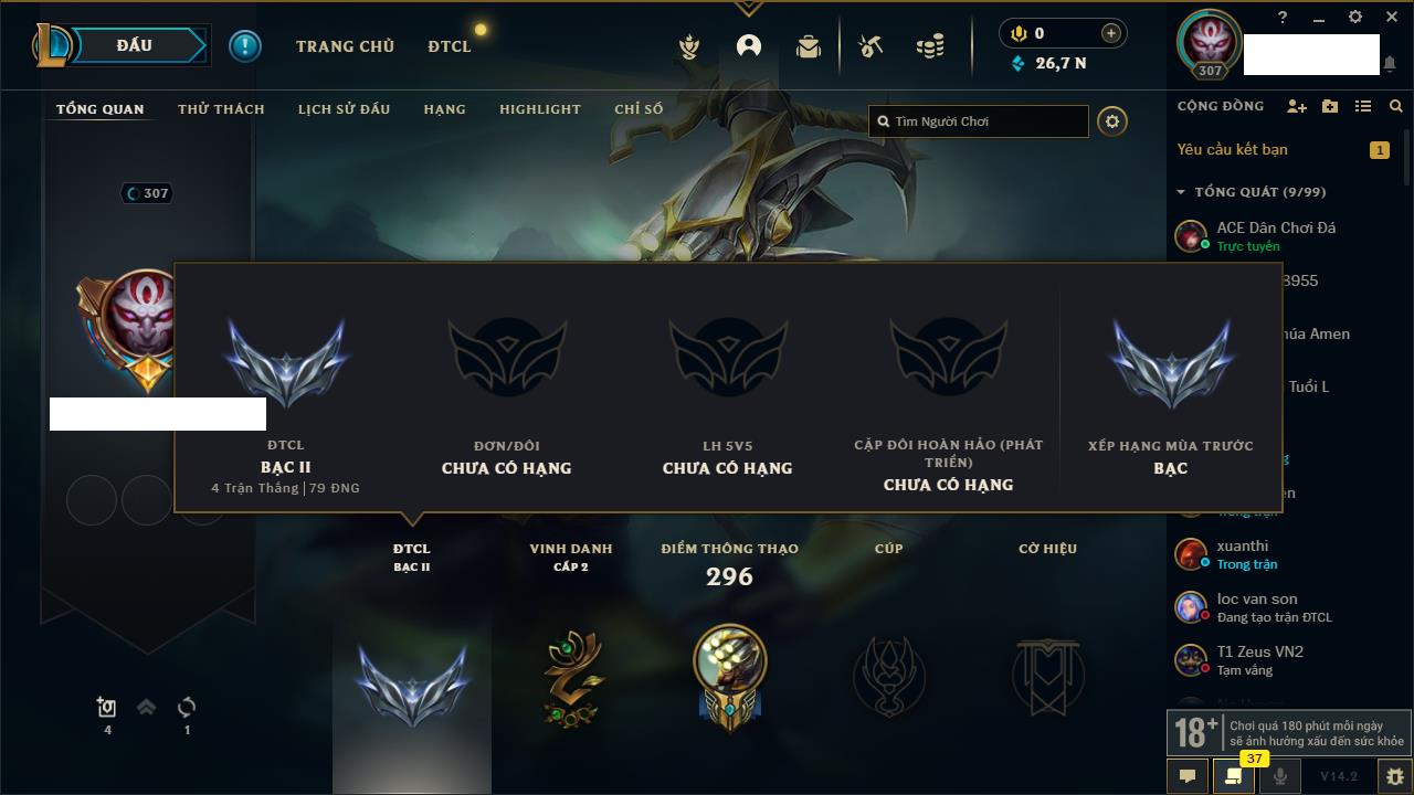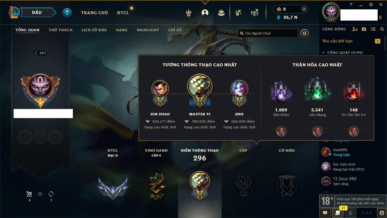 Rank Đơn: Chưa RankKhung: Chưa có khungTướng: 65 - Còn 2075 THXTrang Phục: 10Rank ĐTCL: Chưa RankLinh Thú: 72