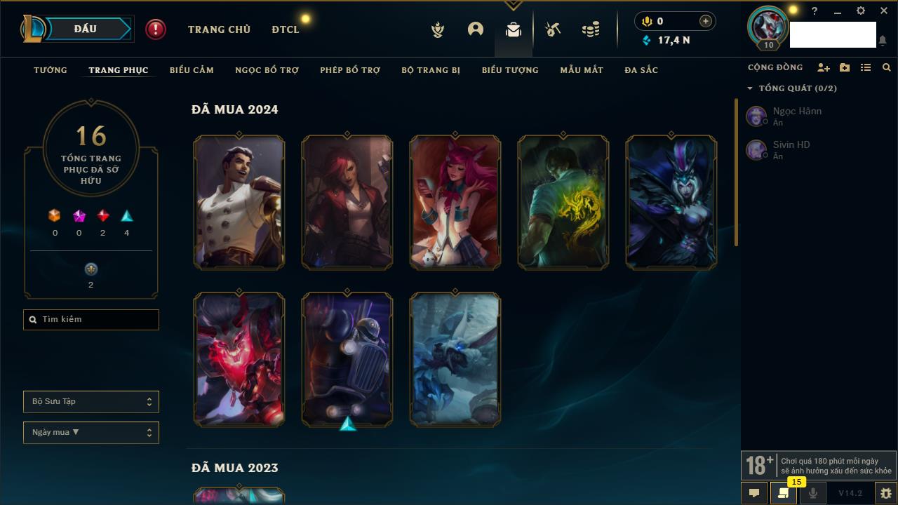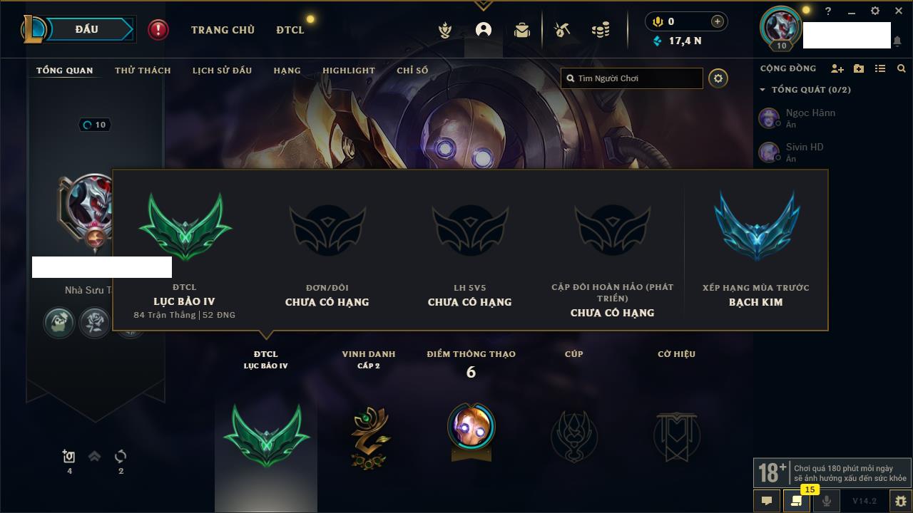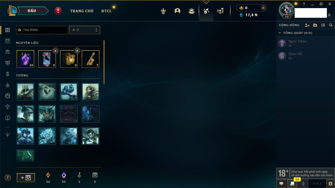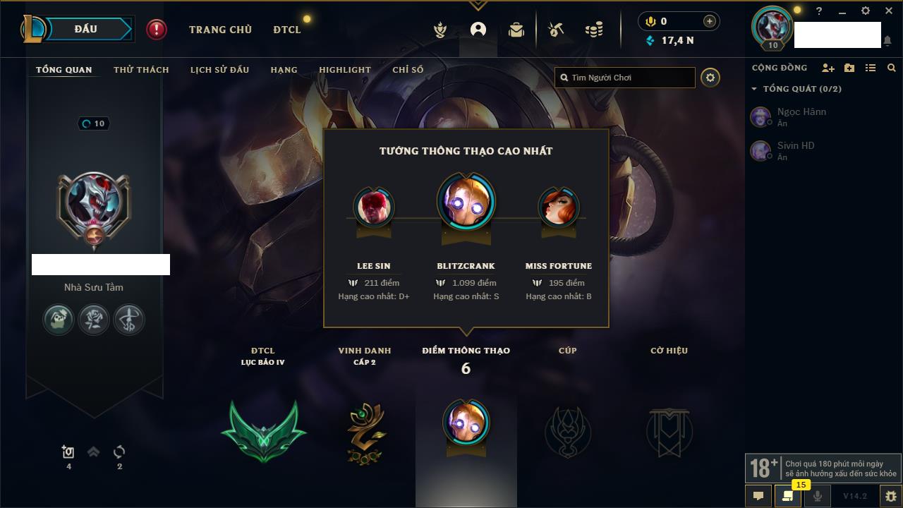Rank Đơn: Chưa rank mùa nàoKhung: Chưa có khungTướng: 145 - Còn 5450 THXTrang Phục: 17Rank ĐTCL: Chưa RankLinh Thú: 14