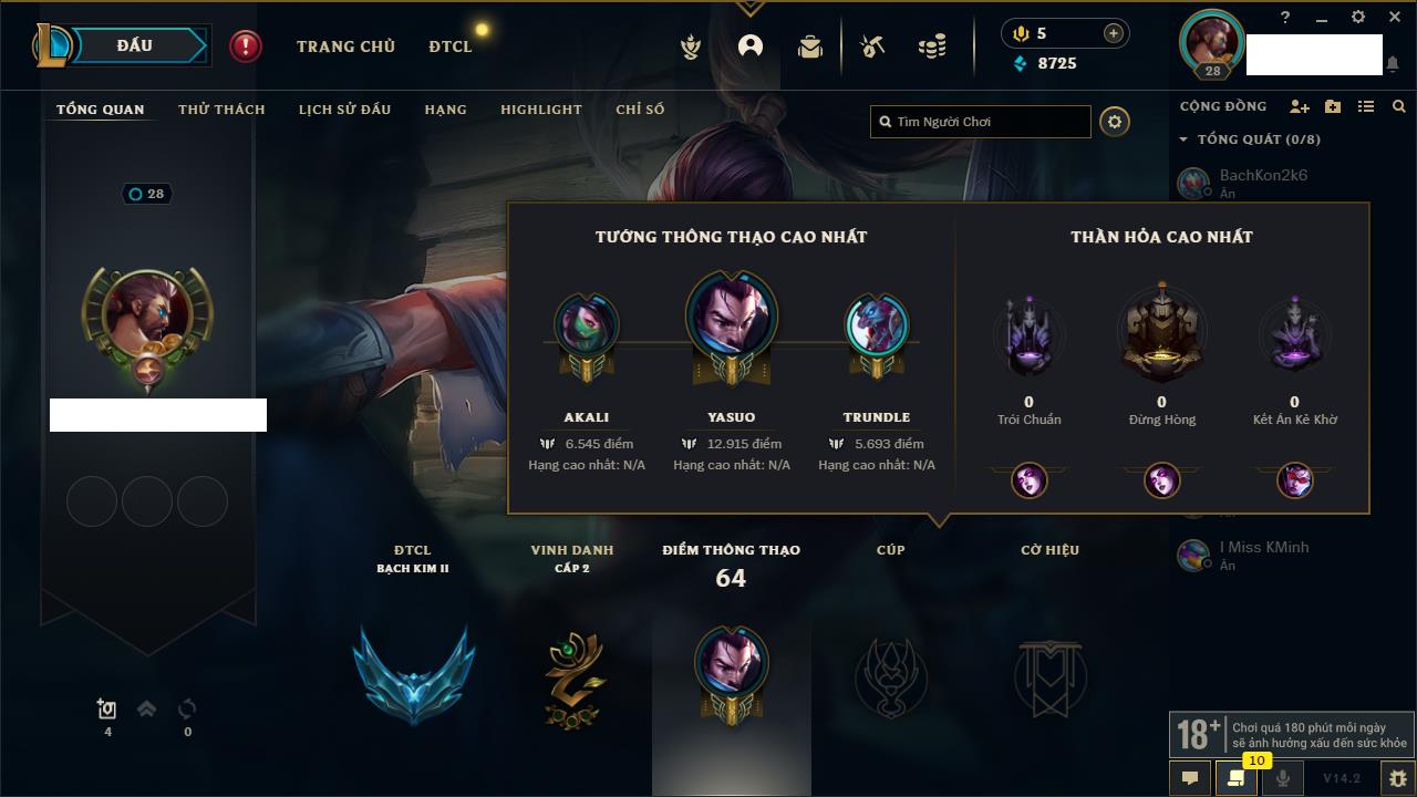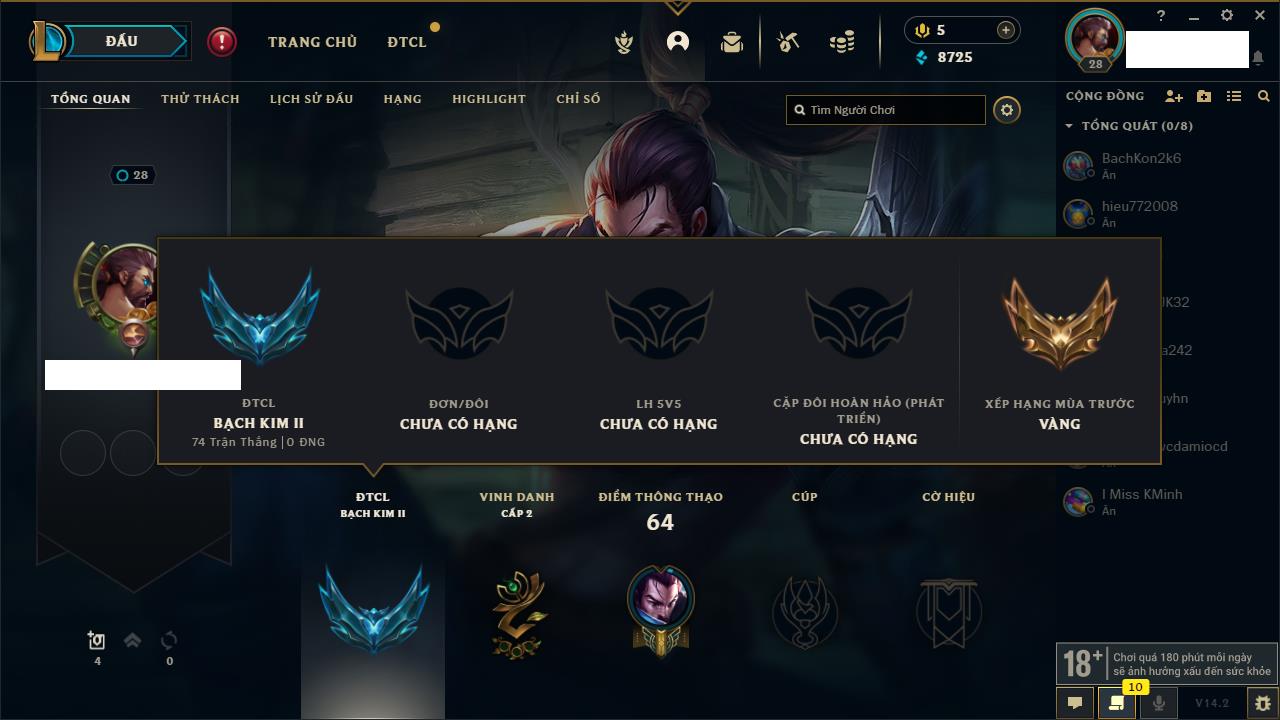 Rank Đơn: Chưa rank mùa nàoKhung: Chưa có khungTướng: 38 - Còn 6280 THXTrang Phục: 2Rank ĐTCL: Chưa RankLinh Thú: 50