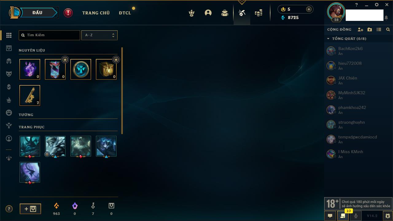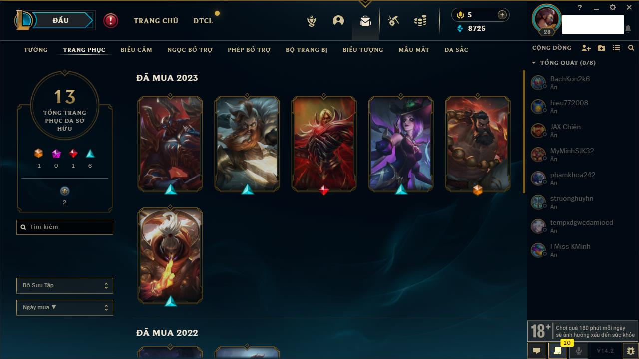 Rank Đơn: Chưa rank mùa nàoKhung: Chưa có khungTướng: 62 - Còn 2196 THXTrang Phục: 17Rank ĐTCL: Chưa RankLinh Thú: 88