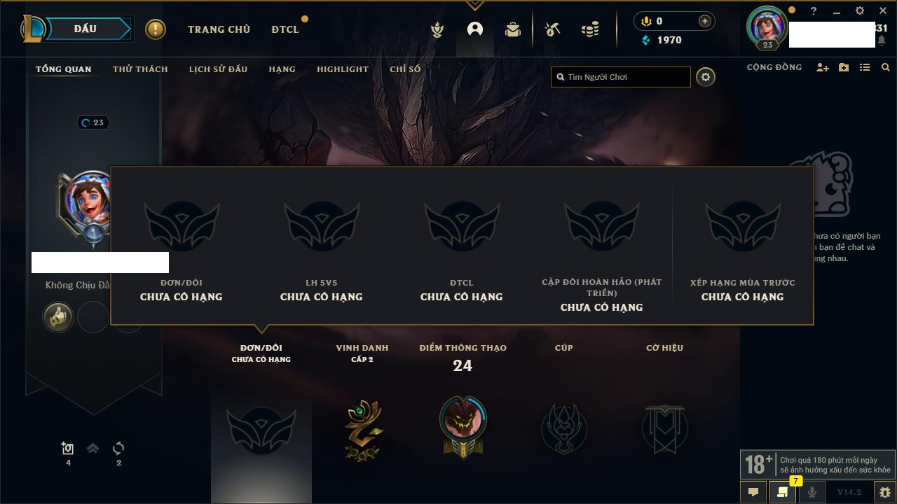 Rank Đơn: Chưa rank mùa nàoKhung: Chưa có khungTướng: 25 - Còn 545 THXTrang Phục: 0Rank ĐTCL: Chưa RankLinh Thú: 3