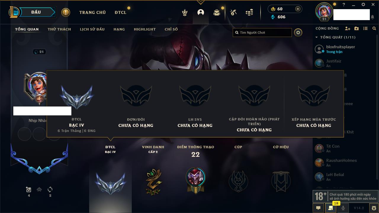 Rank Đơn: Chưa rank mùa nàoKhung: Chưa có khungTướng: 21 - Còn 4695 THXTrang Phục: 1Rank ĐTCL: Chưa RankLinh Thú: 7