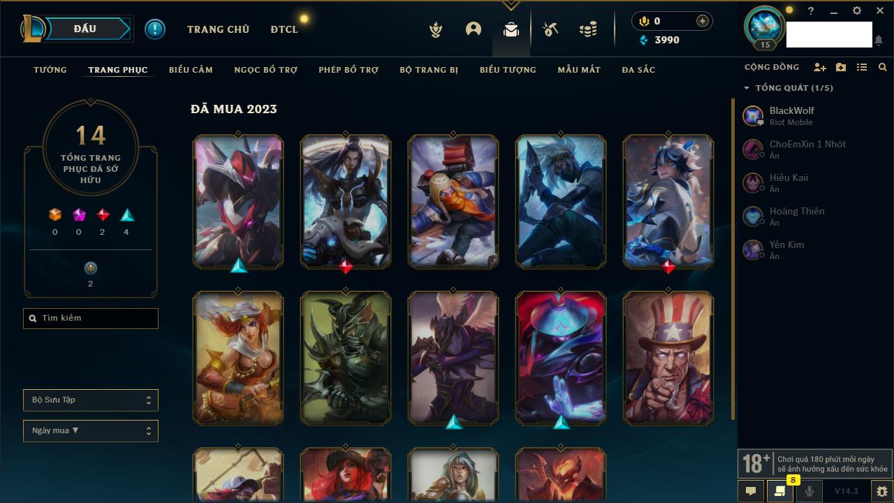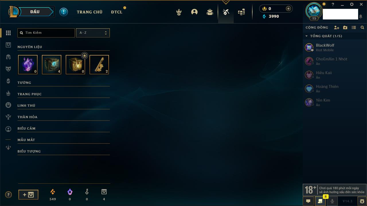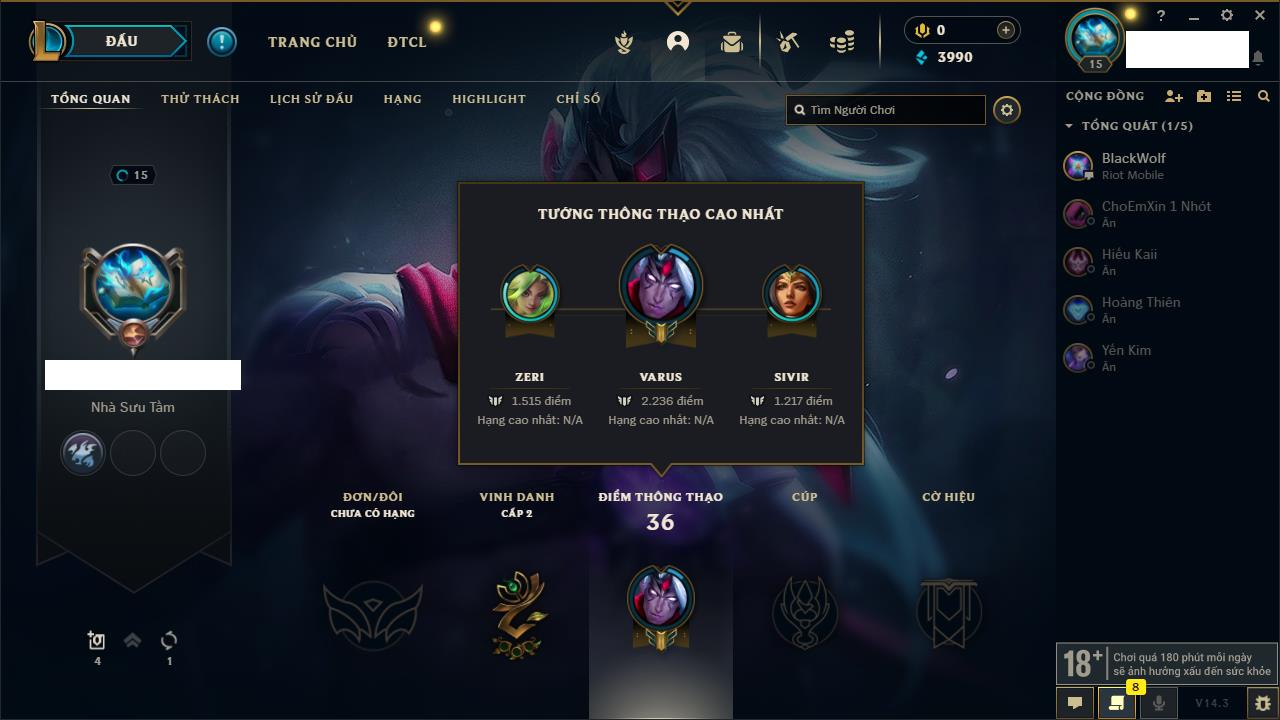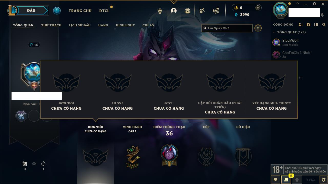 Rank Đơn: Đồng IIKhung: Chưa có khungTướng: 170 - Còn 56487 THXTrang Phục: 90Rank ĐTCL: Chưa RankLinh Thú: 129