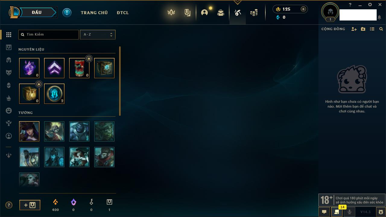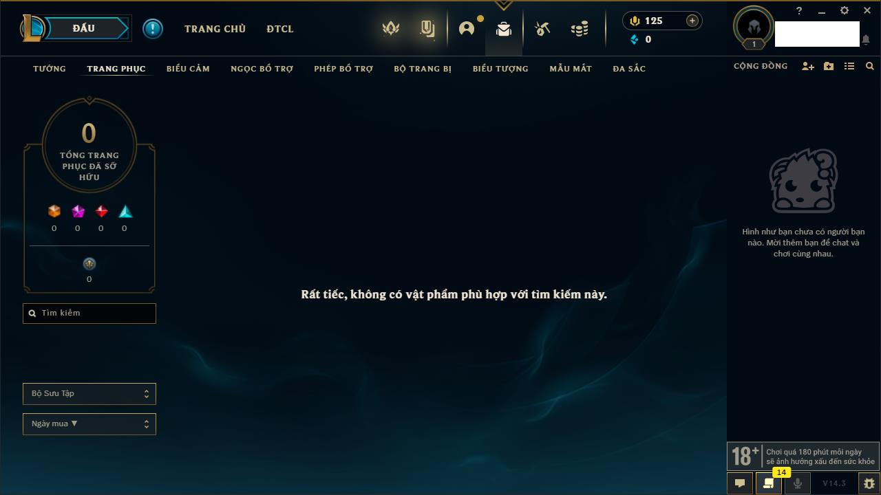 Rank Đơn: Chưa rank mùa nào Khung: Chưa có khung Tướng: 18 - Còn 21345 THX Trang Phục: 2 Rank ĐTCL: Vàng II Linh Thú: 14