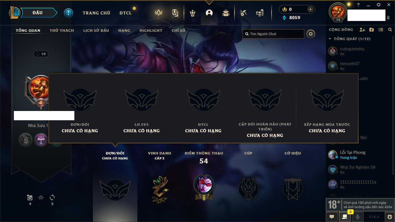 Rank Đơn: Chưa rank mùa nàoKhung: Chưa có khungTướng: 154 - Còn 1660 THXTrang Phục: 6Rank ĐTCL: Chưa RankLinh Thú: 18