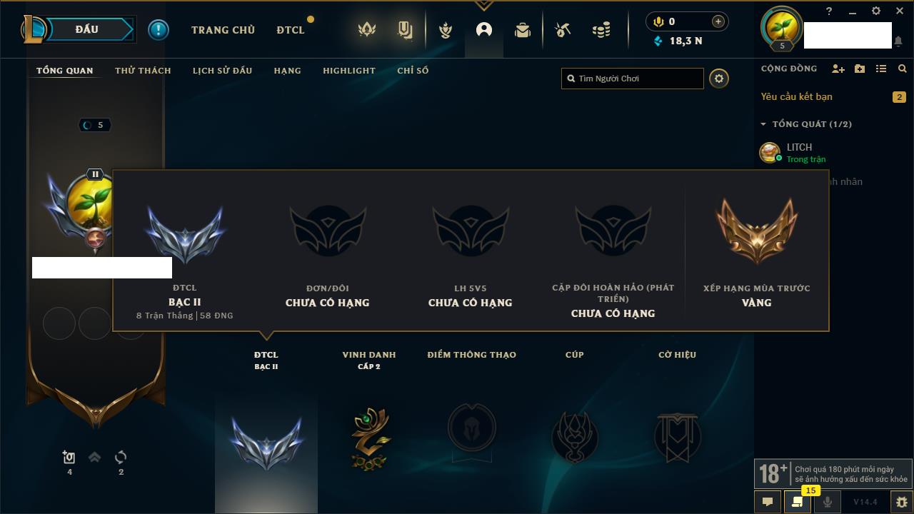 Rank Đơn: Chưa rank mùa nàoKhung: Chưa có khungTướng: 3 - Còn 6810 THXTrang Phục: 0Rank ĐTCL: Chưa rank mùa nàoLinh Thú: 41