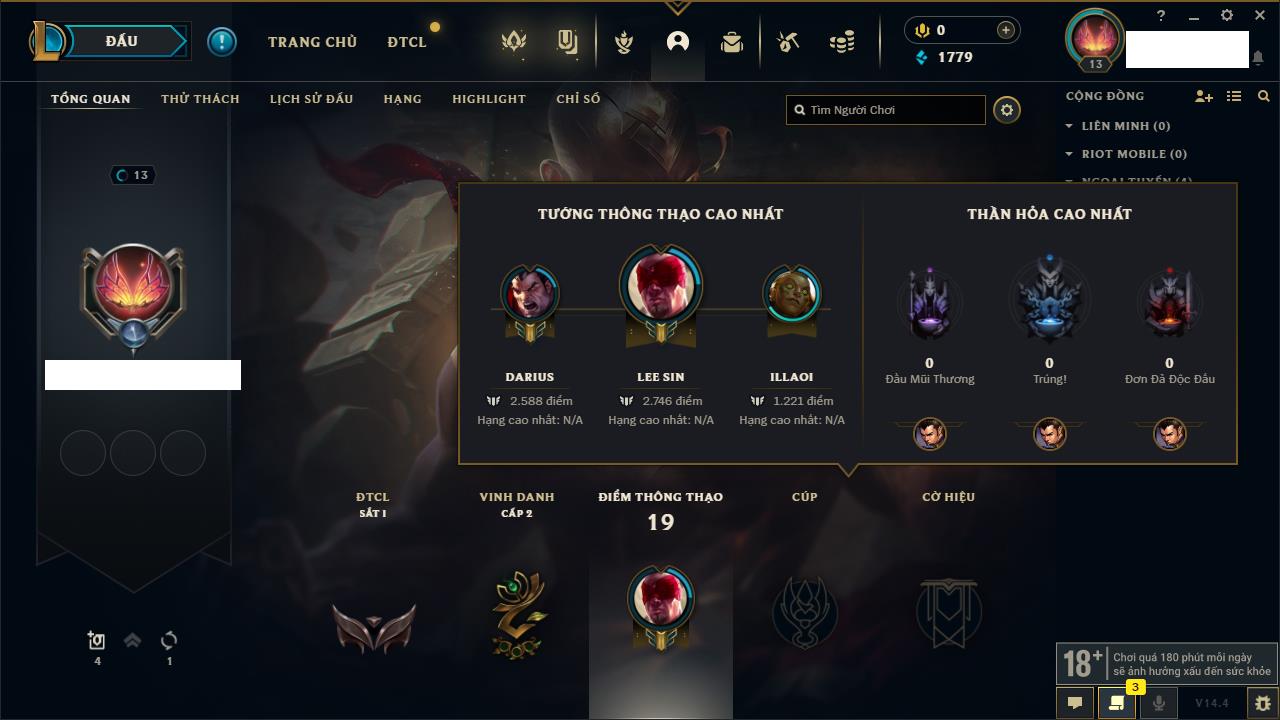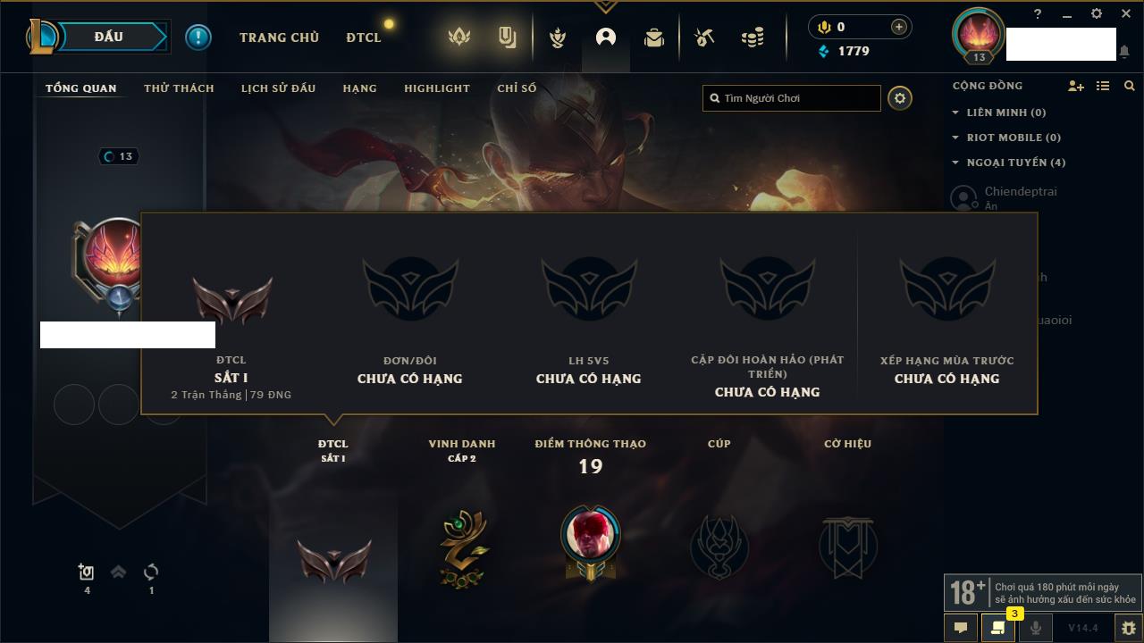 Rank Đơn: Sắt IIIKhung: Chưa có khungTướng: 63 - Còn 185 THXTrang Phục: 8Rank ĐTCL: Chưa RankLinh Thú: 75