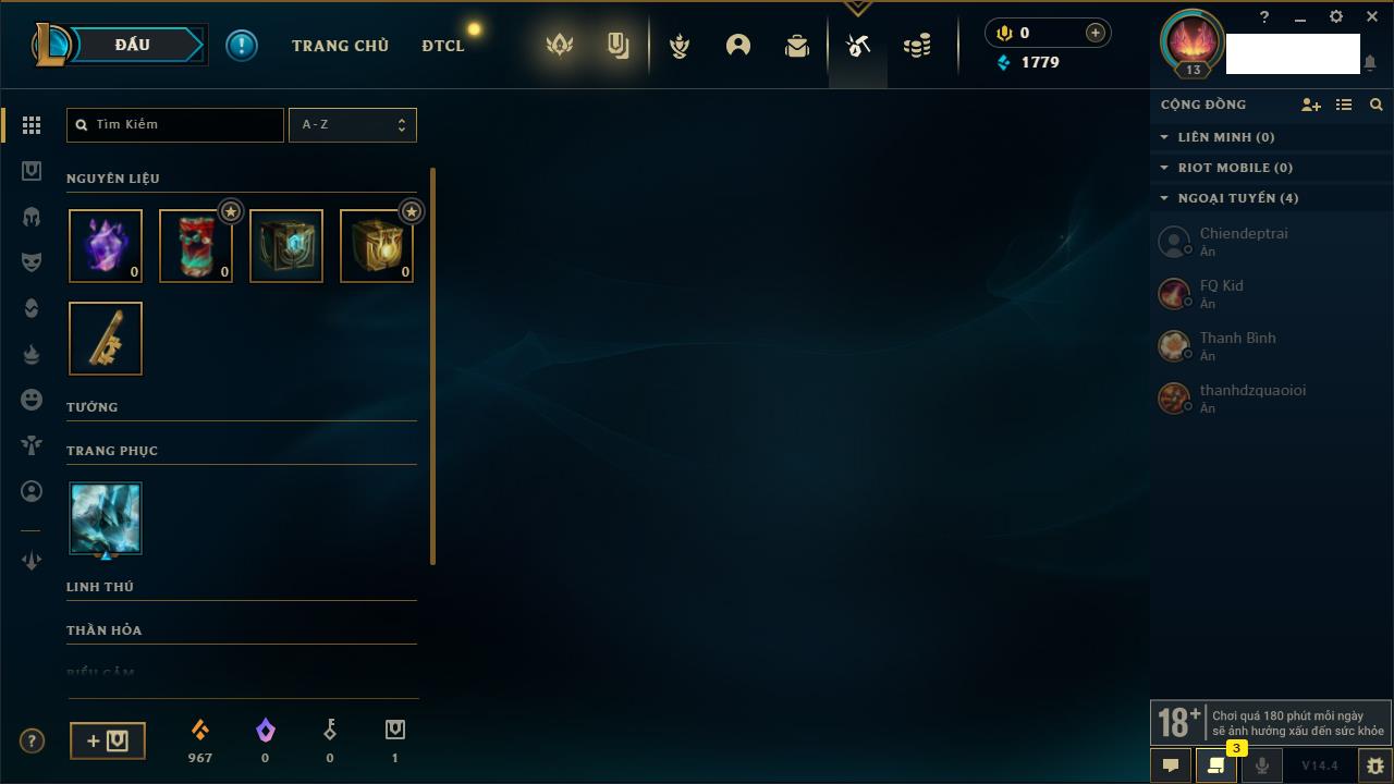 Rank Đơn: Chưa rank mùa nàoKhung: Chưa có khungTướng: 166 - Còn 3090 THXTrang Phục: 9Rank ĐTCL: Chưa RankLinh Thú: 125