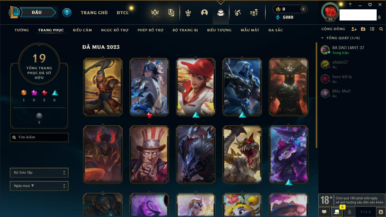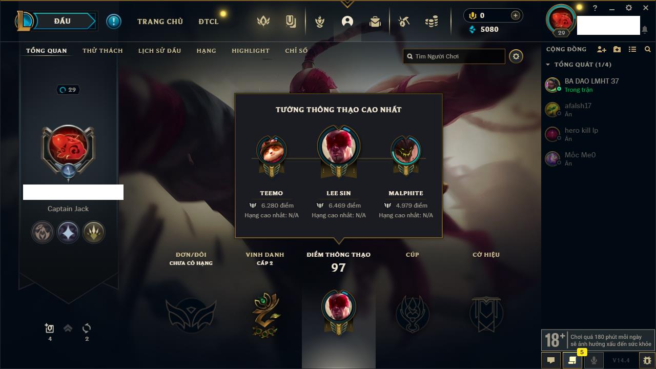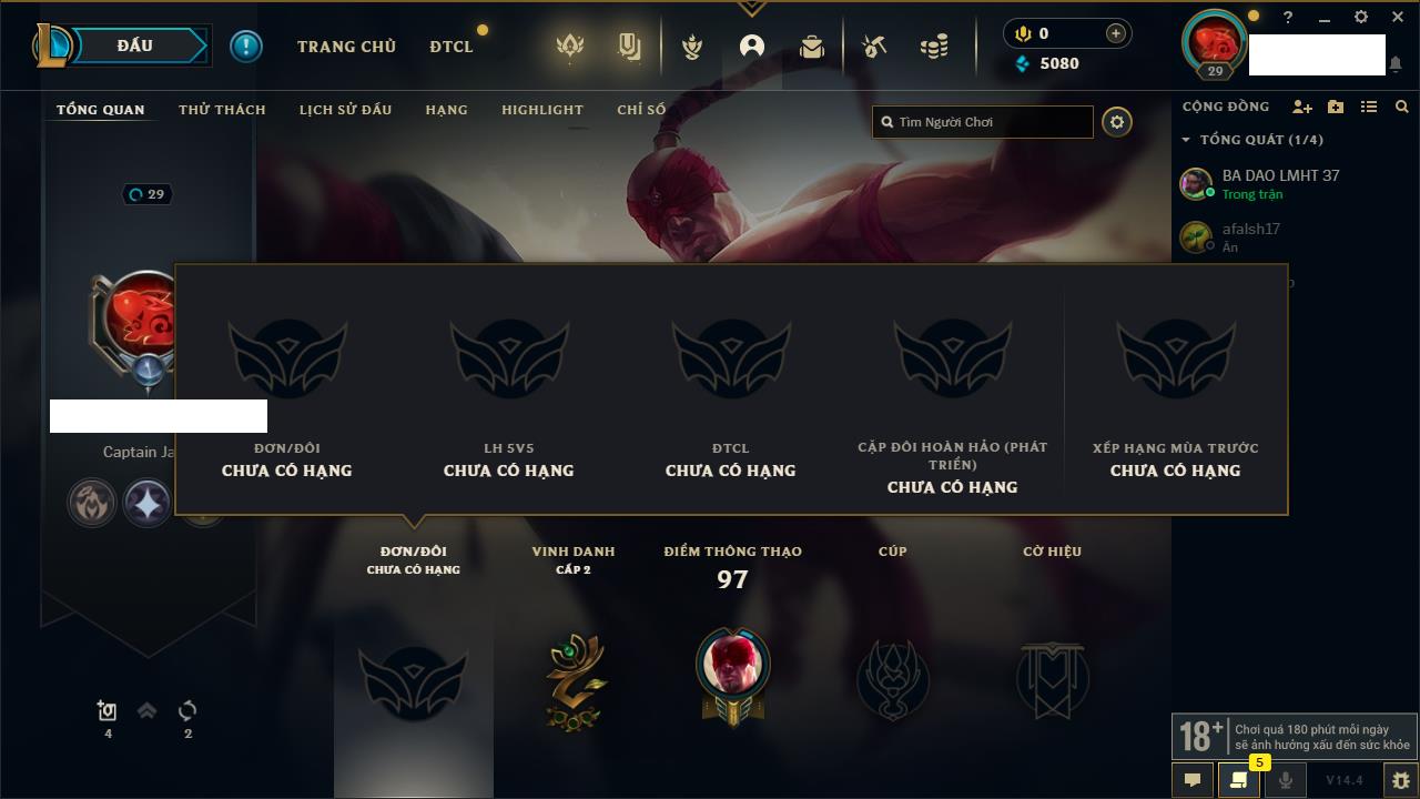 Rank Đơn: Sắt IIIKhung: Chưa có khungTướng: 77 - Còn 8133 THXTrang Phục: 11Rank ĐTCL: Bạch Kim IVLinh Thú: 108