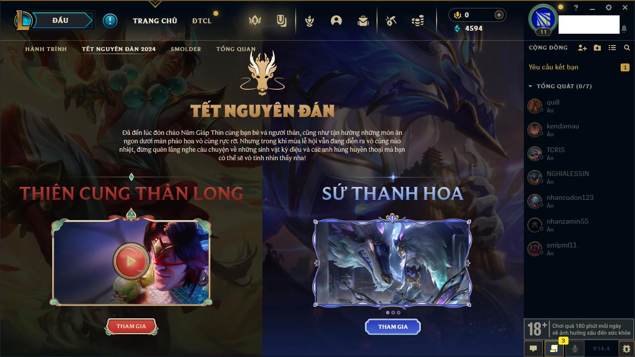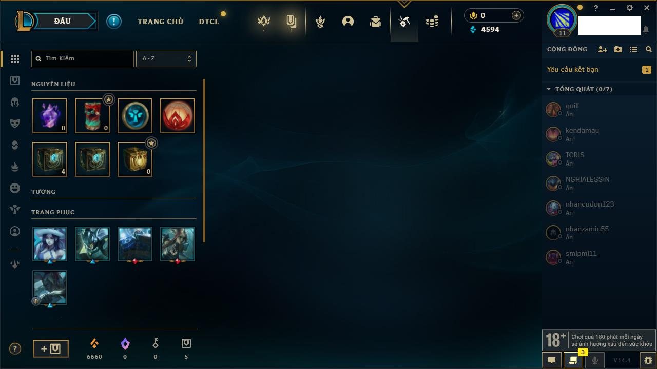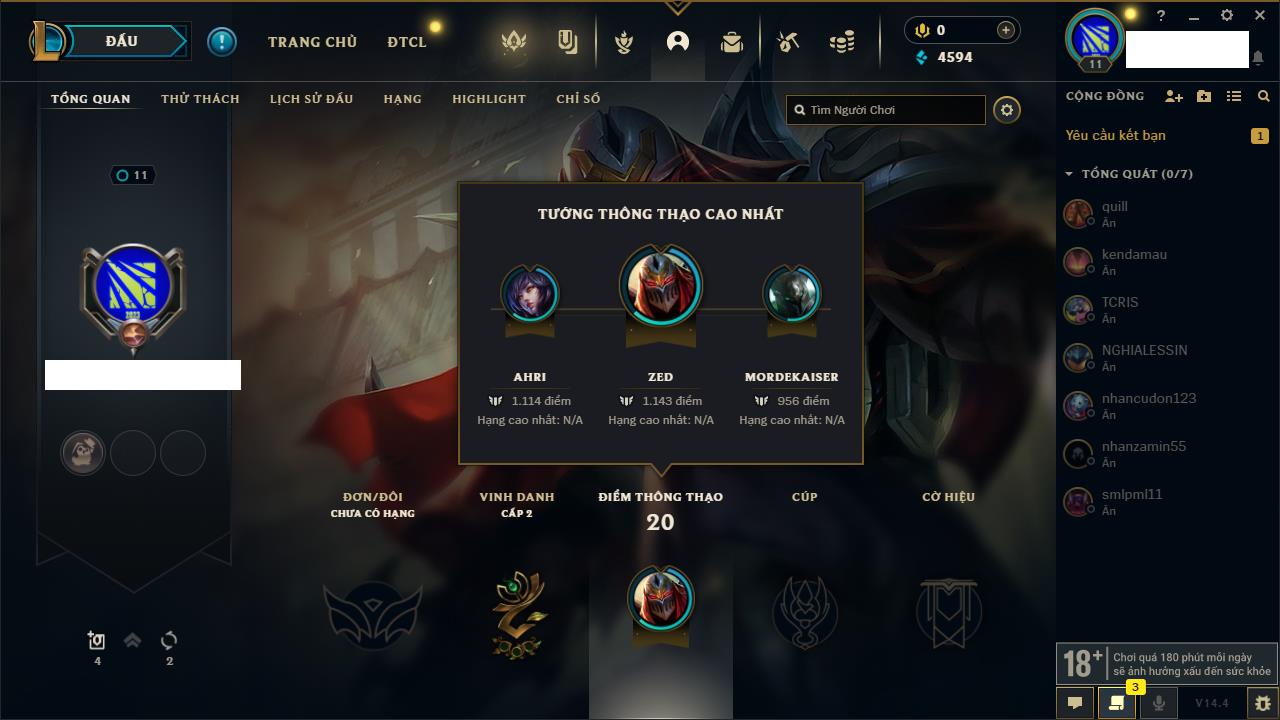 Rank Đơn: Chưa rank mùa nàoKhung: Chưa có khungTướng: 154 - Còn 1660 THXTrang Phục: 6Rank ĐTCL: Chưa RankLinh Thú: 18