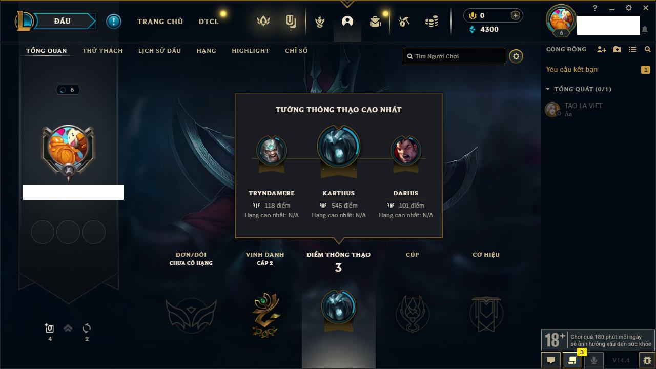 Rank Đơn: Sắt IIIKhung: Chưa có khungTướng: 88 - Còn 1376 THXTrang Phục: 12Rank ĐTCL: Bạc IVLinh Thú: 69