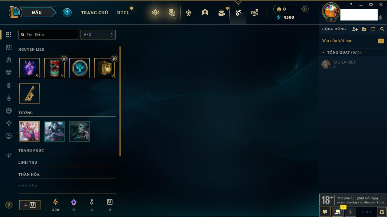 Rank Đơn: Đồng IIIKhung: Chưa có khungTướng: 86 - Còn 14367 THXTrang Phục: 19Rank ĐTCL: Vàng IIILinh Thú: 95