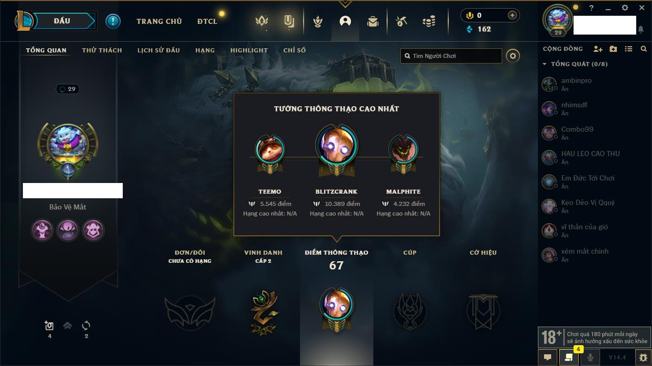Rank Đơn: Chưa rank mùa nàoKhung: Chưa có khungTướng: 0 - Còn 14550 THXTrang Phục: 0Rank ĐTCL: Chưa RankLinh Thú: 50